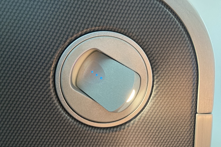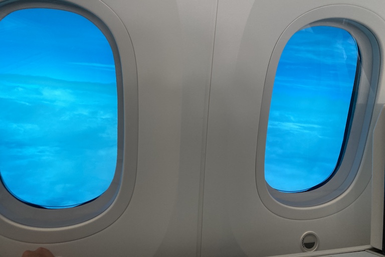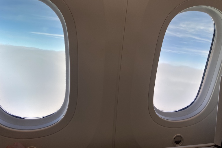 Most seats in the 787-9 business class cabin have two windows. Instead of a pull-down shade, they have an electronic dimmer, with a range of settings from clear daylight to borderline blackout.