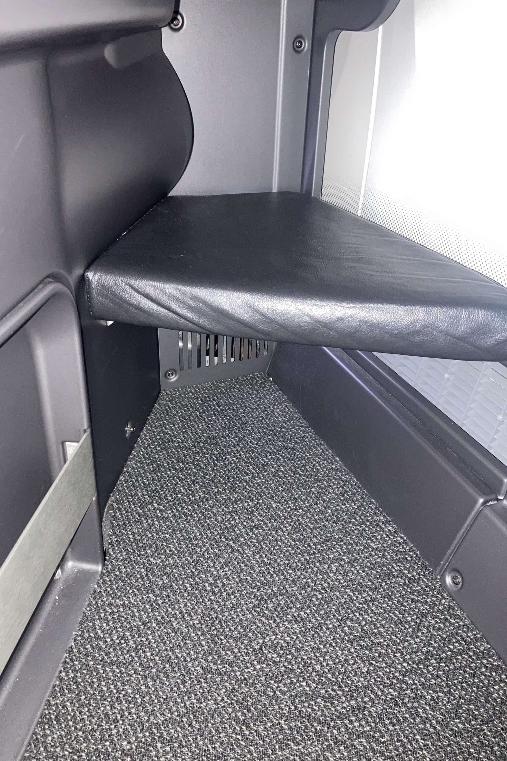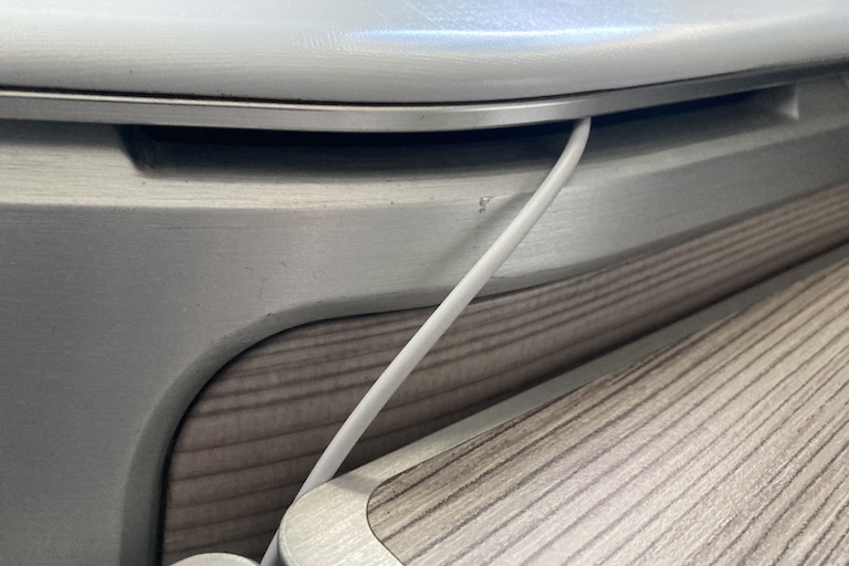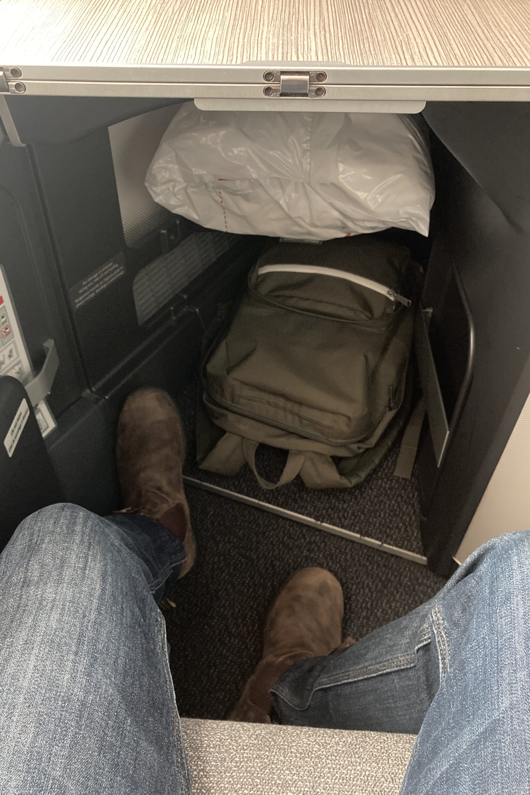 There’s a chamber under the aisle-side armrest, which I used for stashing bottled water and snacks.