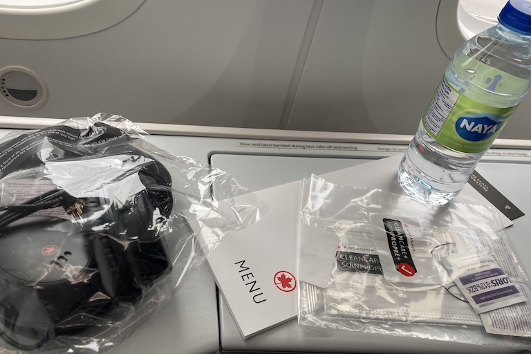 On the outbound, I arrived to a menu at my seat, along with bottled water, noise-cancelling headphones, and a COVID-19 sanitary kit including a spare mask in case I needed it.