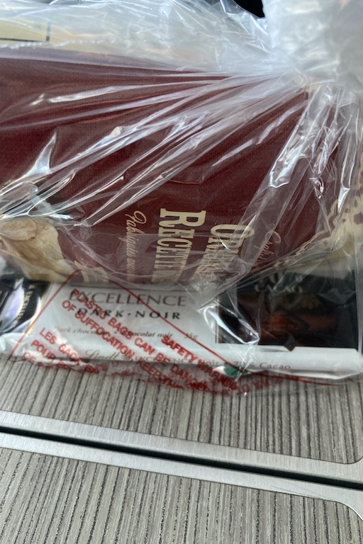 Towards the end of the flight, the attendants came around with a bag of Miss Vickies chips and a Lindt dark chocolate bar, packaged a bit excessively (presumably for COVID-19 sanitary reasons). These proved useful for snacking after I had deplaned.
