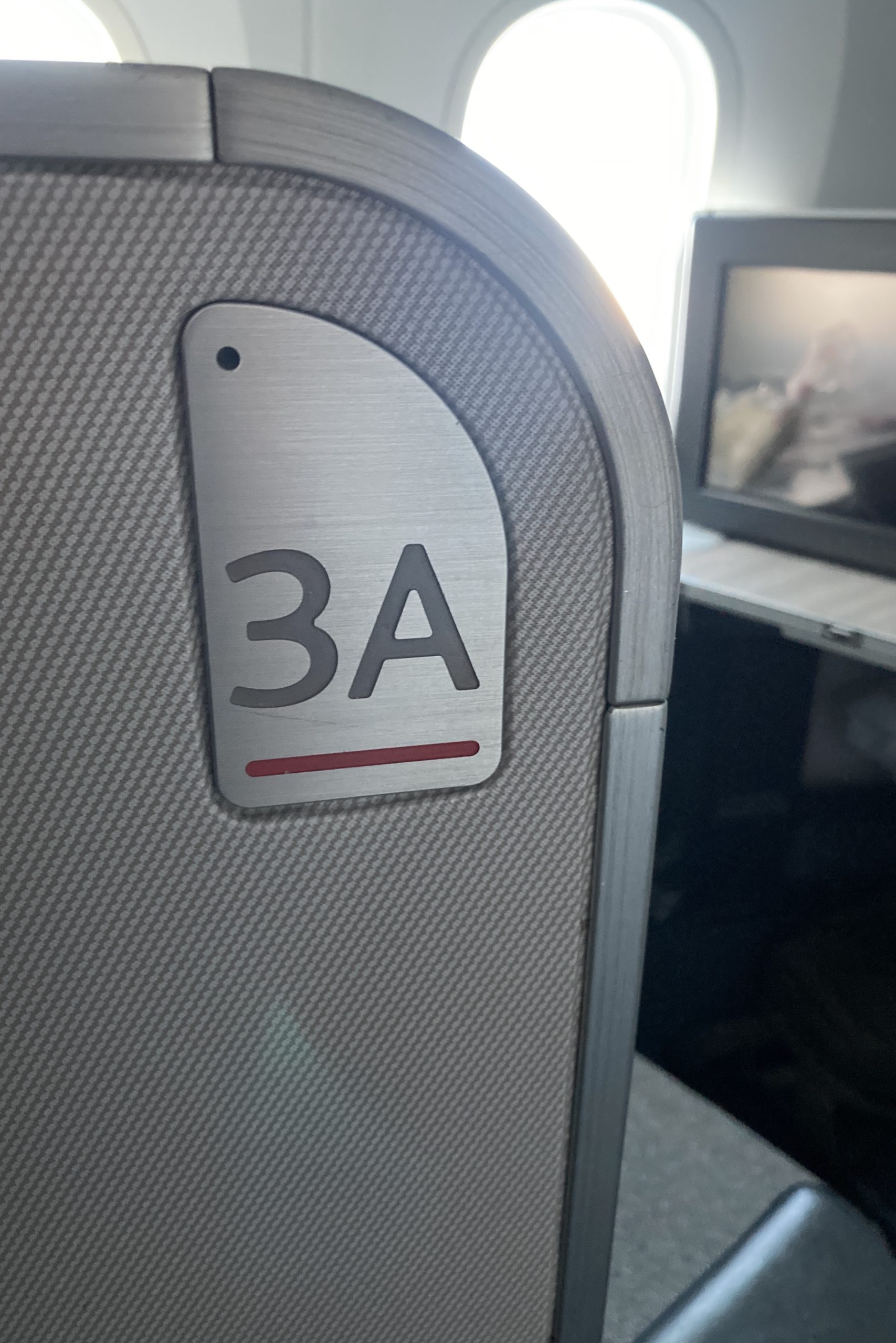 I almost always prefer a window seat. I was seated in 3A on the outbound, and 3K (a mirror image) on the inbound.