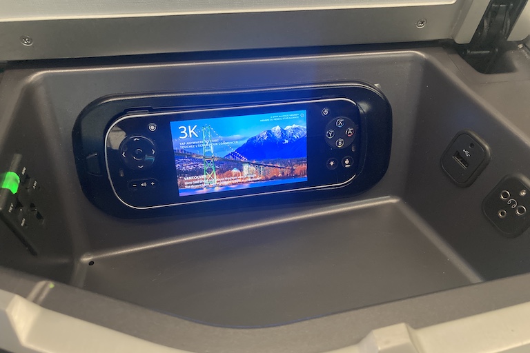 The entertainment console is built into the window-side. Inside, there’s an adaptive power outlet, a USB outlet, and a headphone jack for whatever proprietary three-prong abomination the airline industry has been using lately.