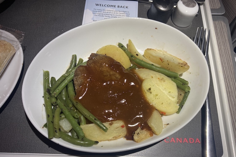 For the westbound leg, I ordered the beef dish, which paired exceptionally well with a steady stream of red wine. My delicious plate included beef tenderloin, fingerling potatoes, and steamed green beans.