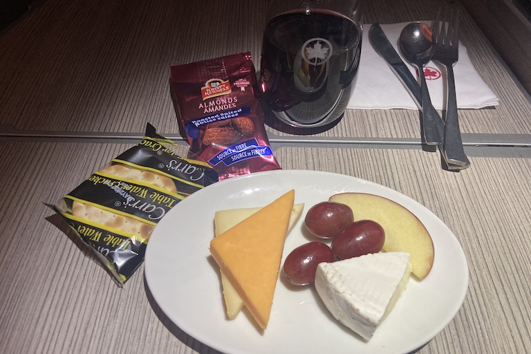For dessert, I took the cheese plate, with oka, cheddar, and brie, plus a token apple slice and a few grapes. The flight attendant wasted no time offering me a port pairing.