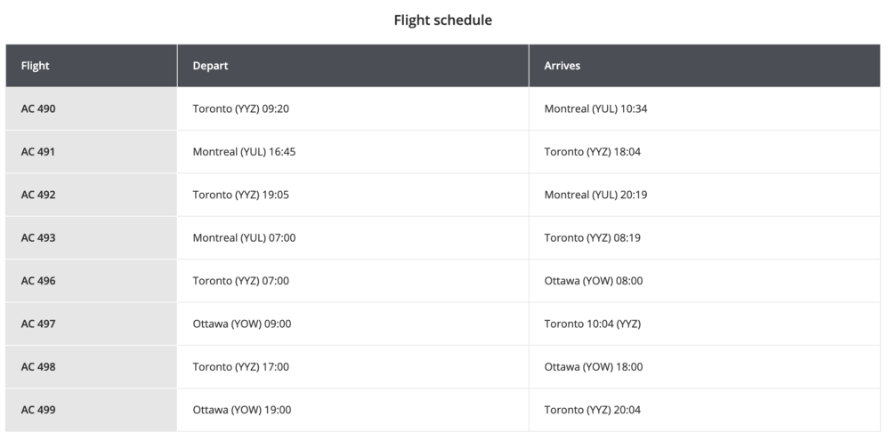 The Jetz aircraft will operate a total eight flights per day, which consists of two flights in each direction from Toronto to Ottawa and Montreal. These flights can be identified by their flight numbers between AC490 and AC499, according to the schedule below.