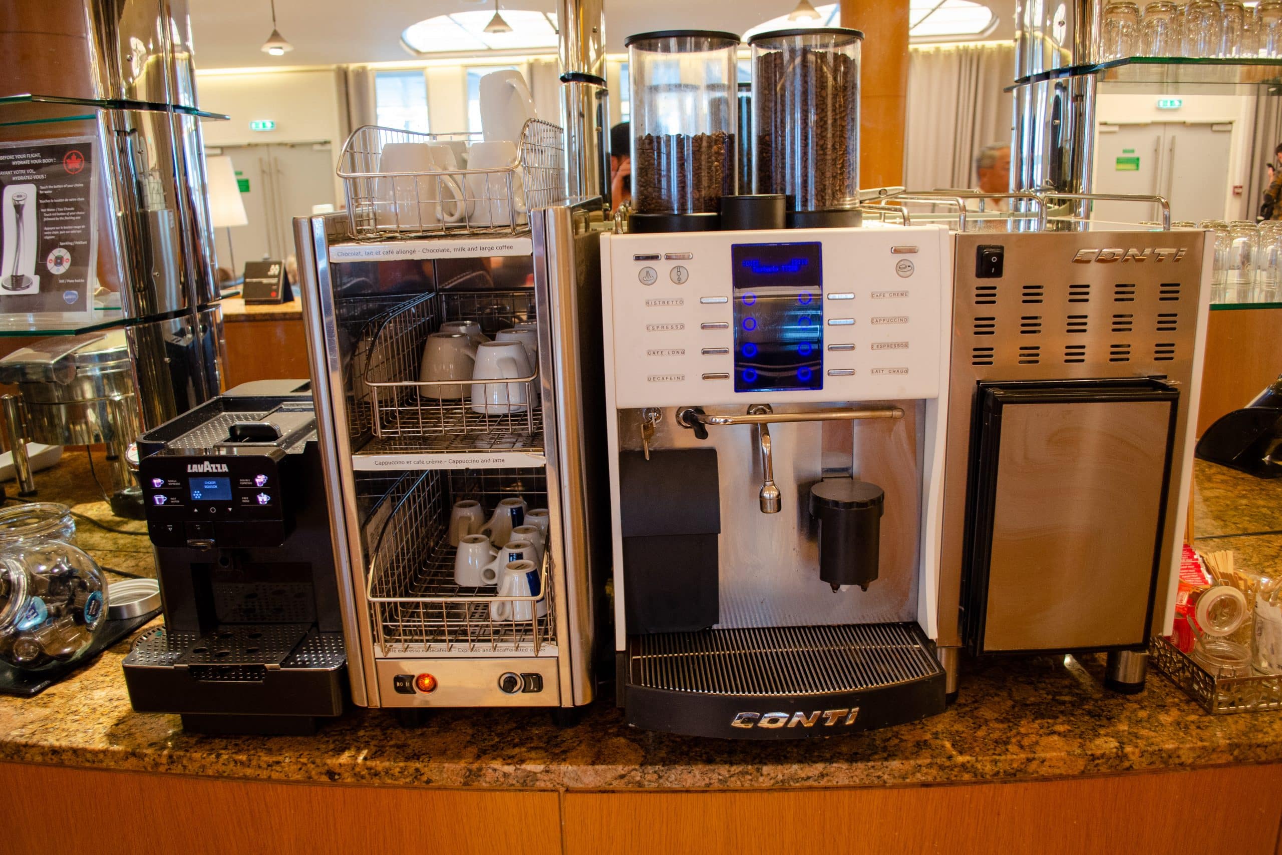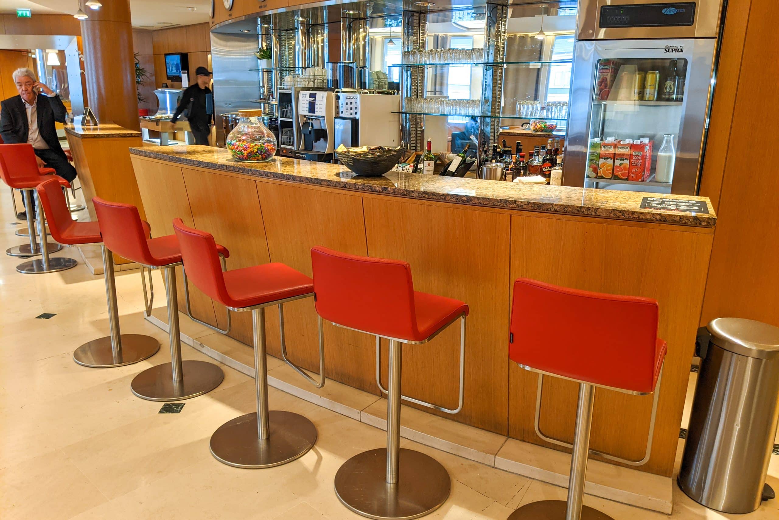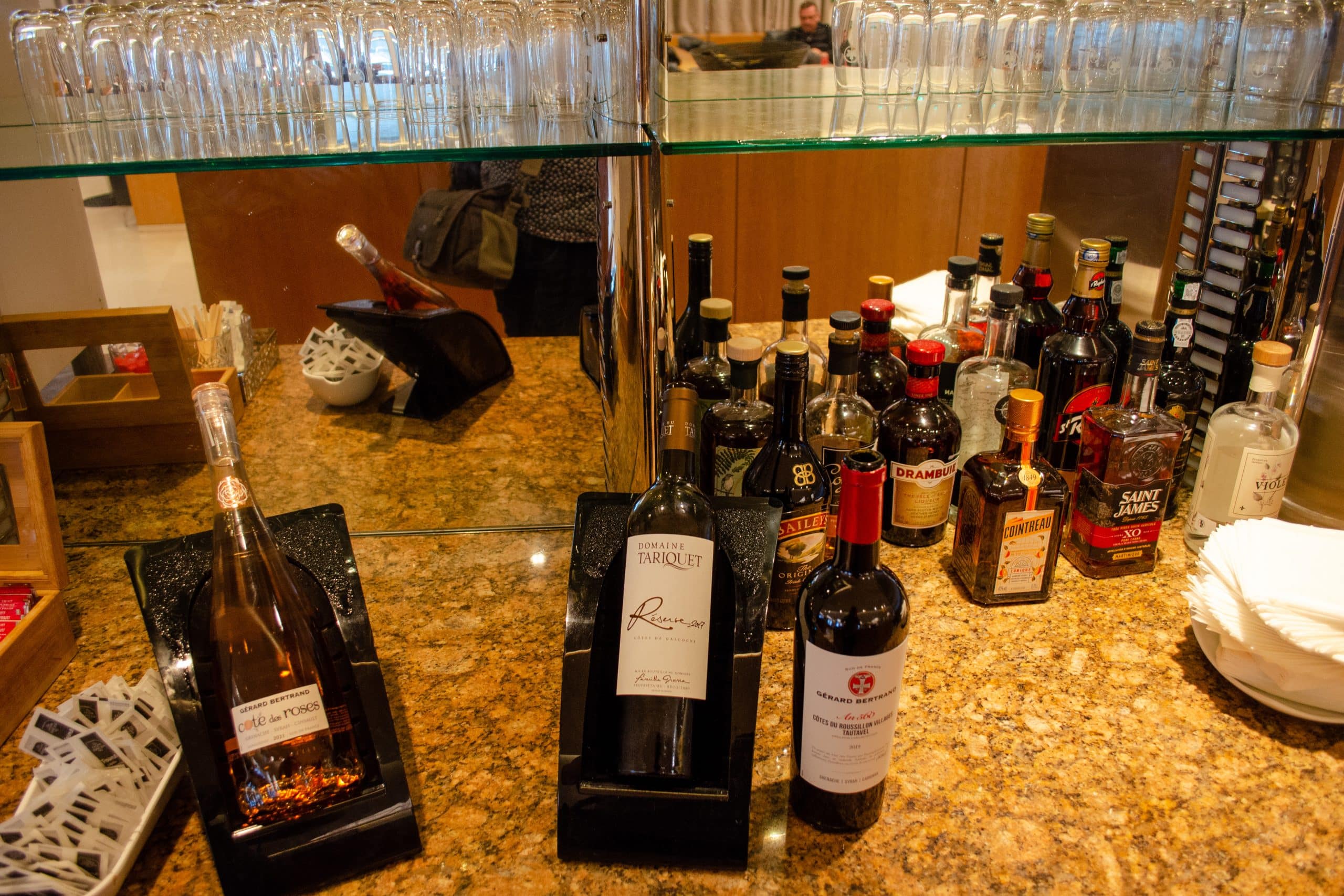 The bar area featured a variety of self-serve options, including a number of French wines and liquors. An automatic coffee machine serves up caffeinated beverages, and there’s a fridge with other cold drinks at your disposal.