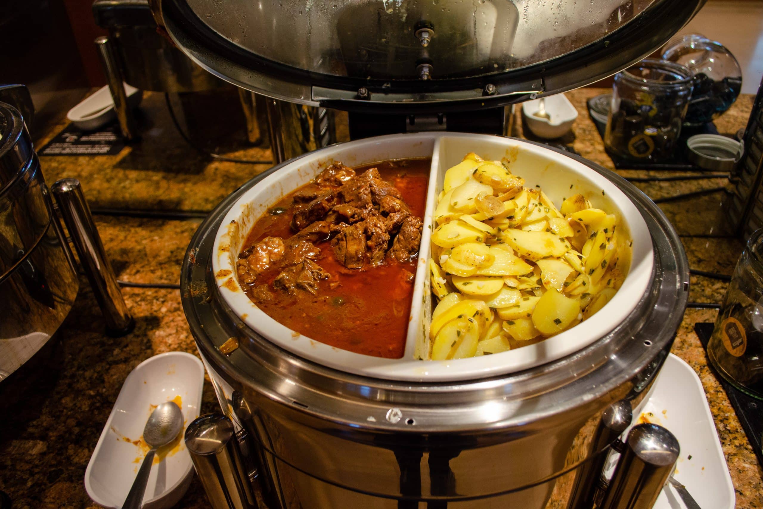 The buffet area featured several food stations, with some cold items such as sandwiches, cold cuts, and yogurt, as well as pastries and desserts. The hot buffet items during my visit featured beef daube à la provençale alongside some scalloped potatoes.