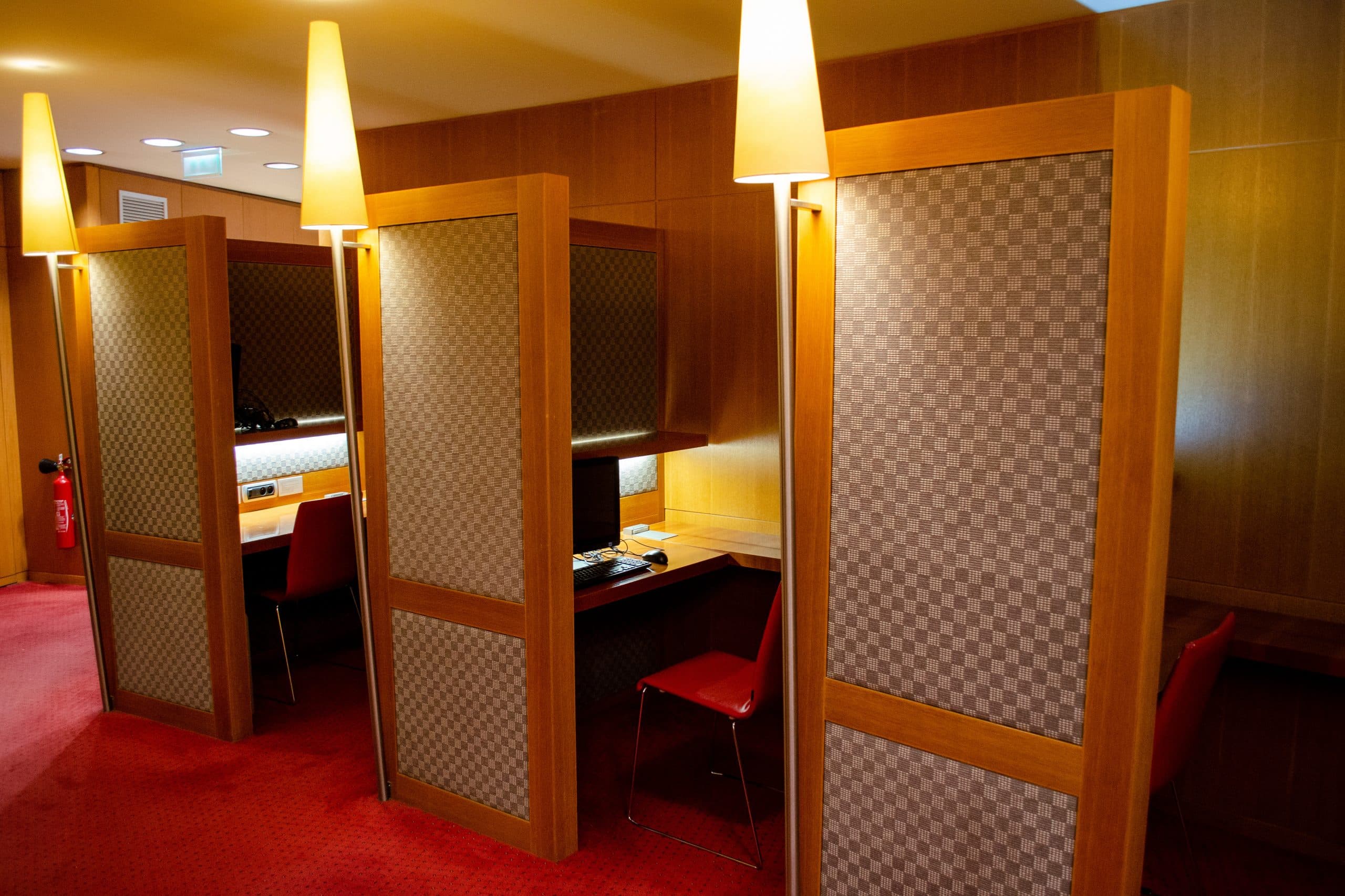 Further to the back of this area is a business centre, where there are a dozen classy, private stations with a checkered wall, red carpet, and tall lamps.