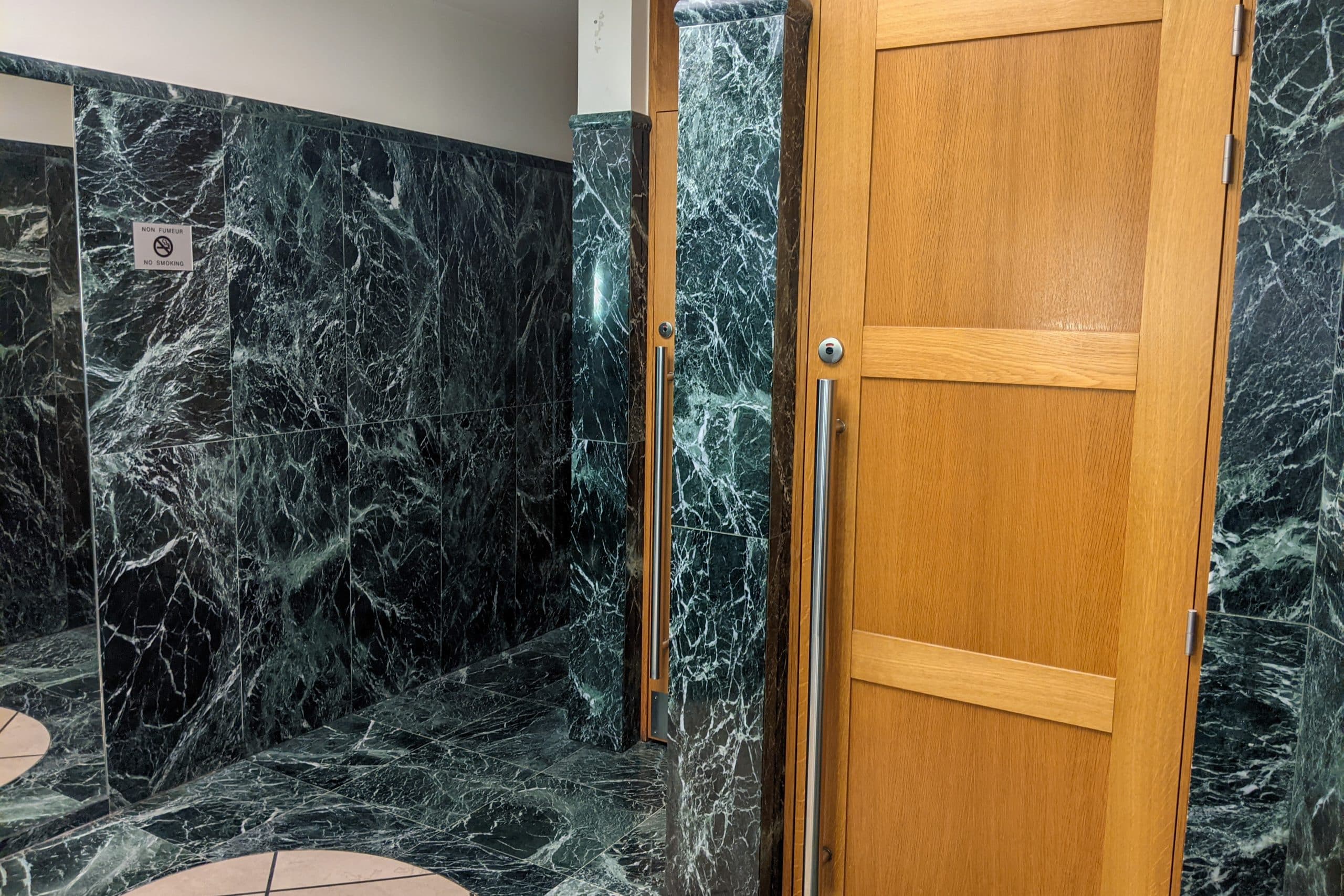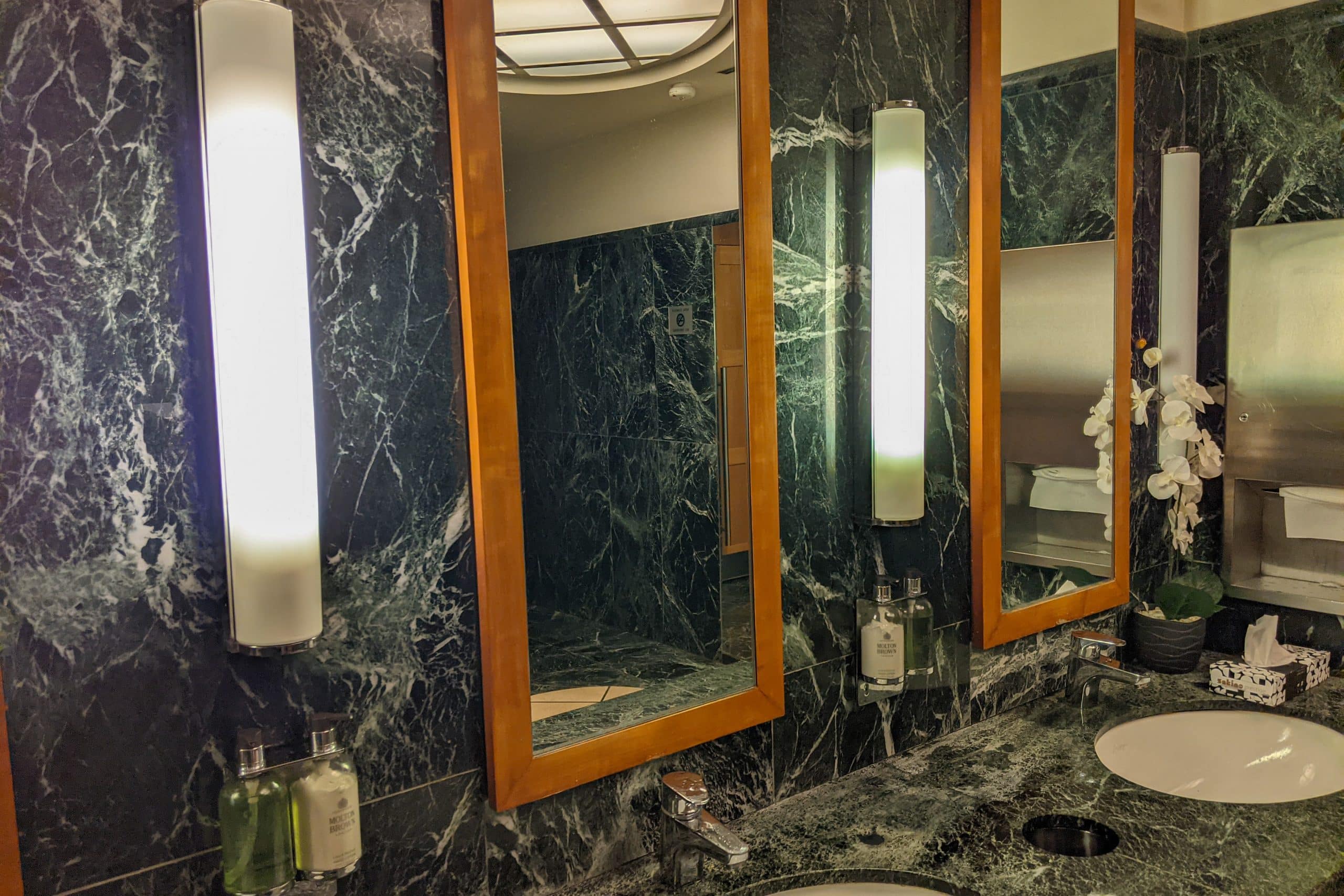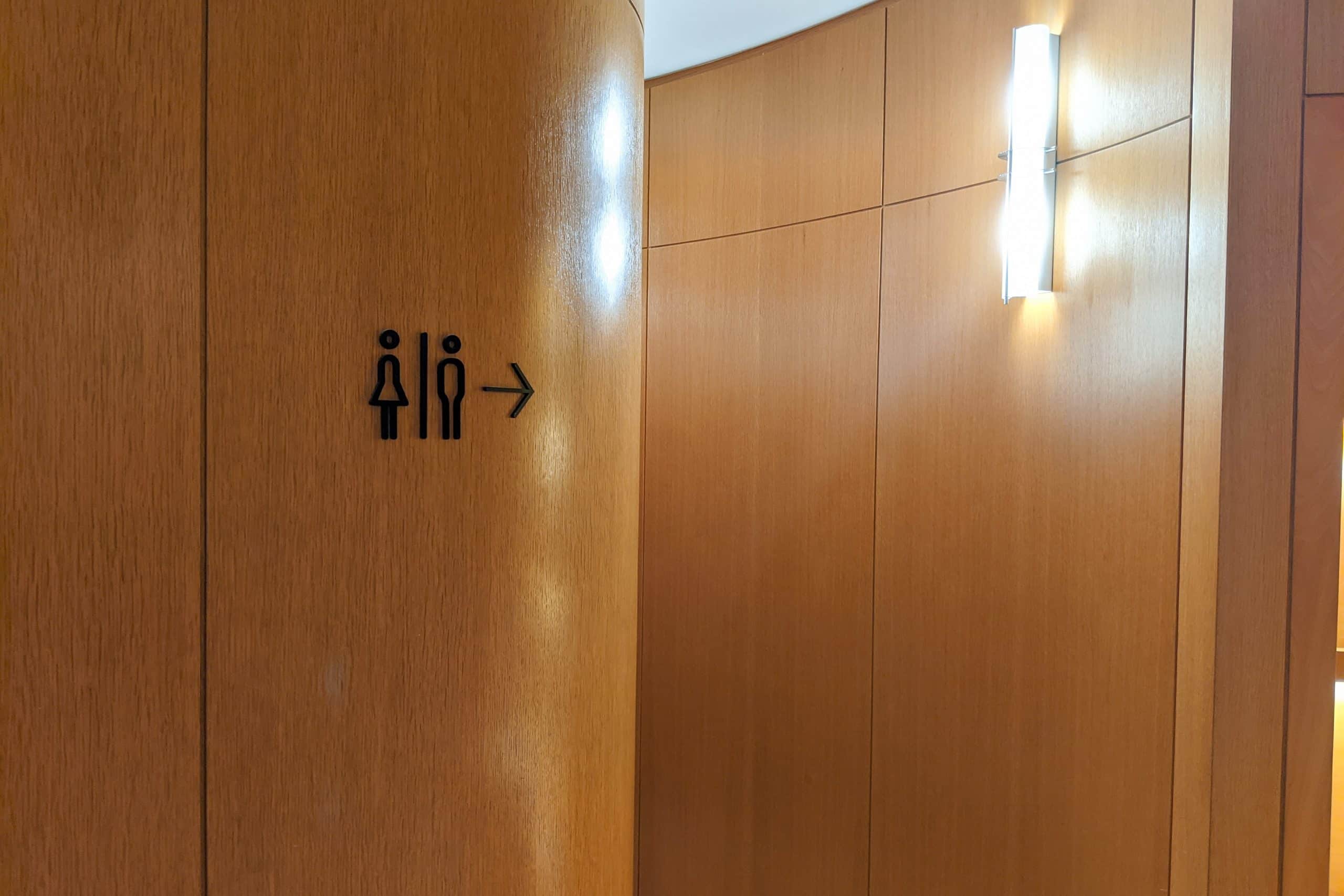 The restrooms are tucked behind the main food and bar area, along a circular hallway, with interiors that are a mixture of marble and wood. Unfortunately, there are no shower facilities in this lounge.