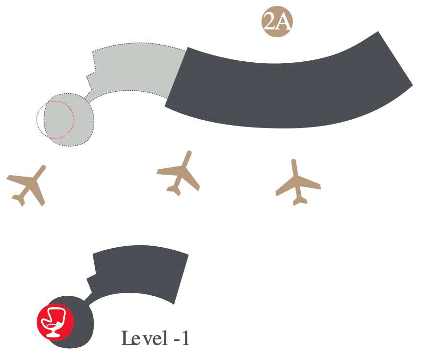 The lounge is located at the very end of the “A” gates in Terminal 2A.