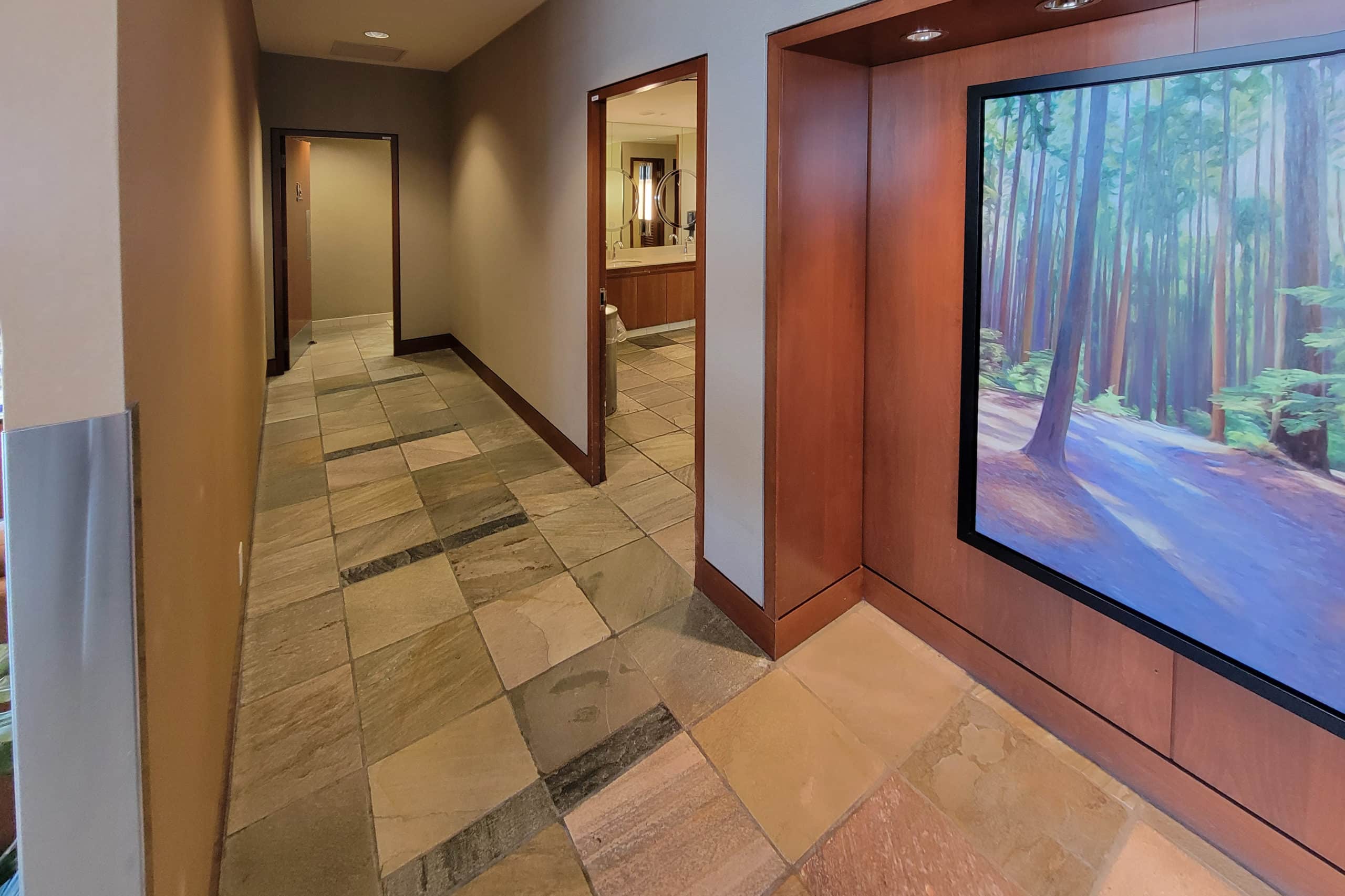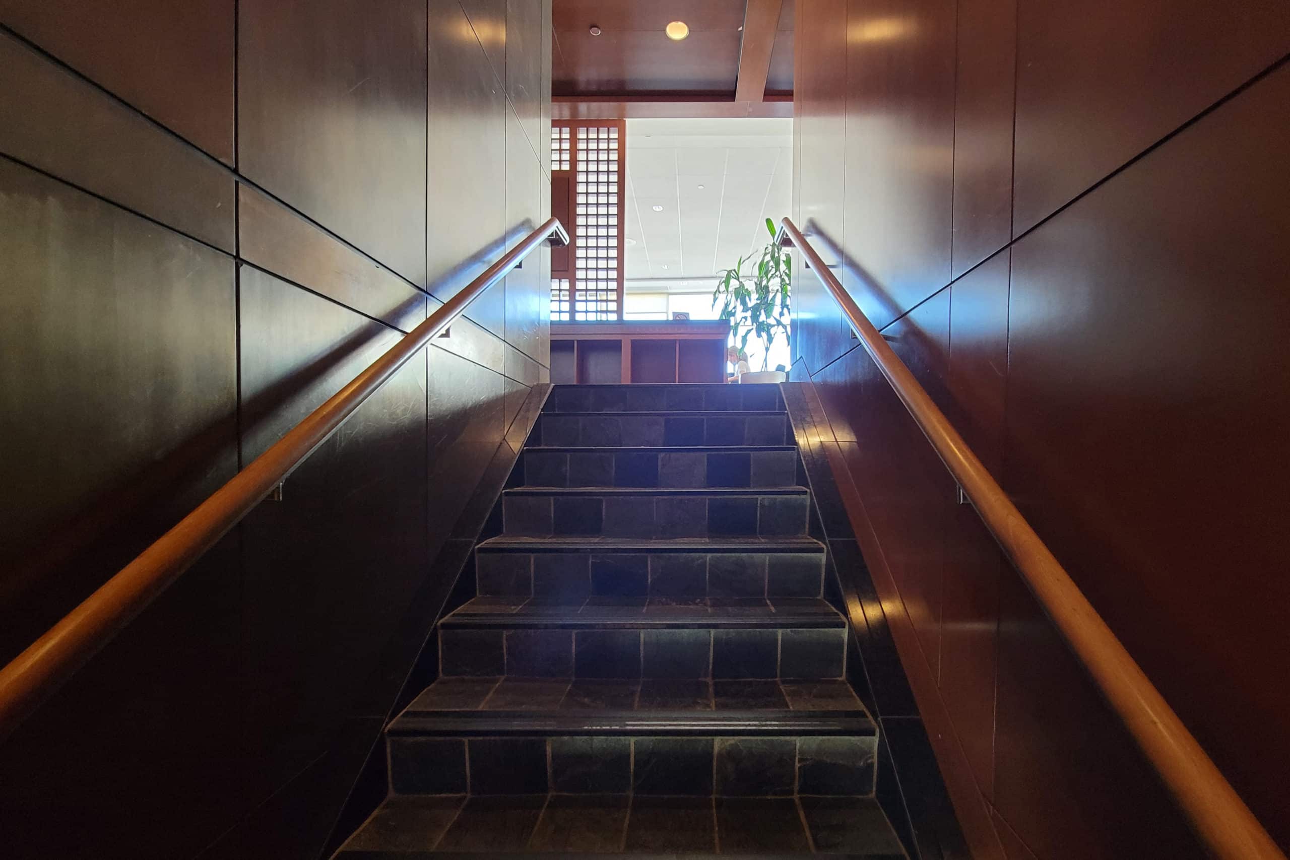 The overall design of the lounge is quite long. To the right of the entrance staircase are the restrooms, located down a hallway.