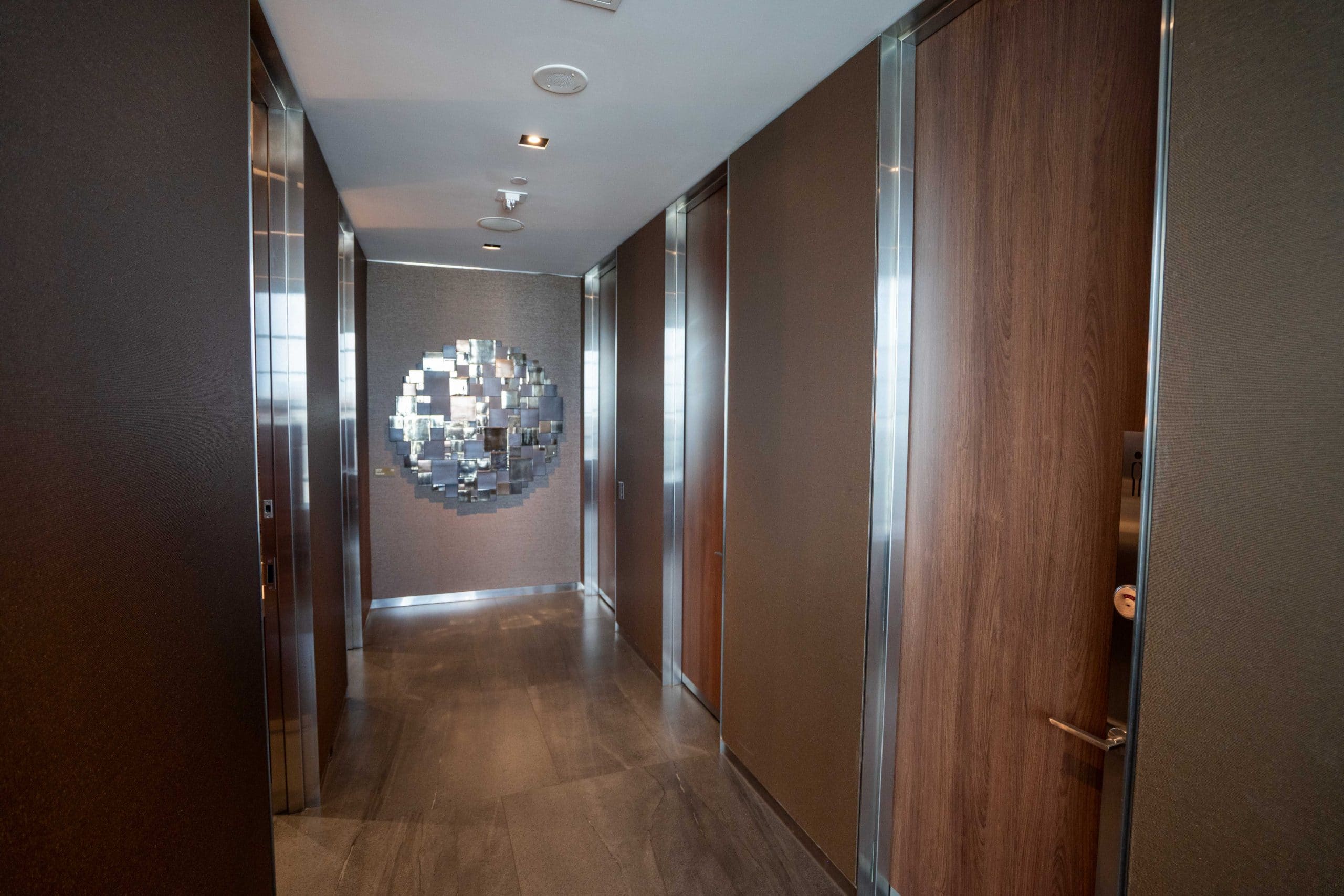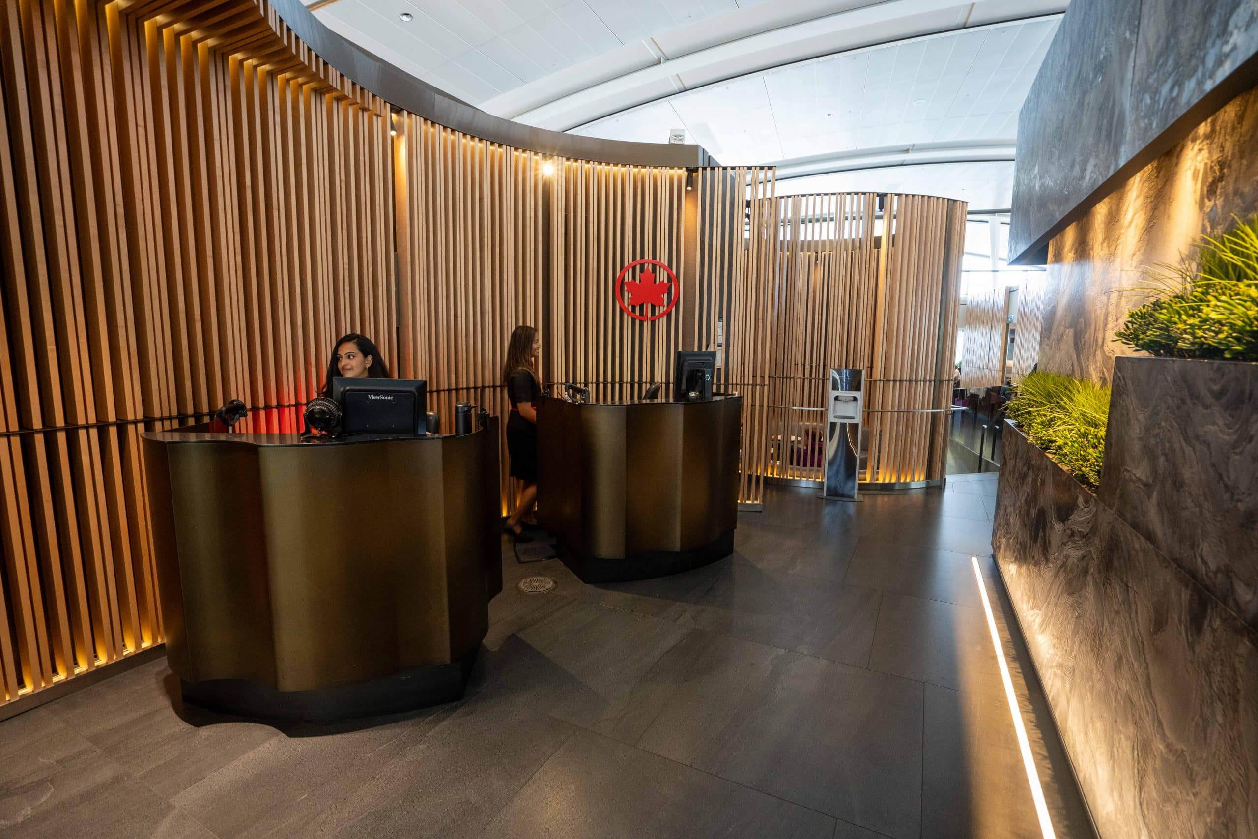 The entrance welcomes you with slatted wooden walls, accented by sleek black elements and distinctive Air Canada details. Continuing past the reception area, a marble feature wall adorned with live plants captures your attention on the right.