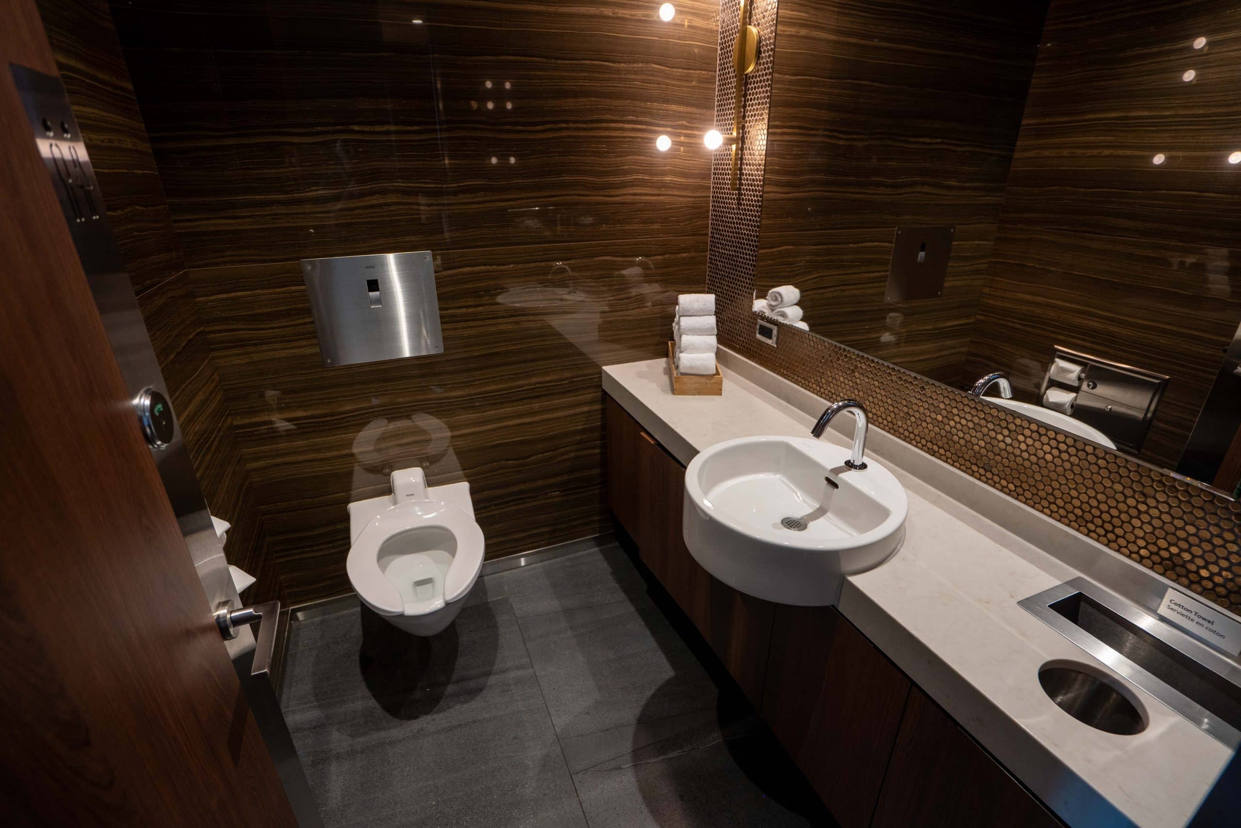 The restrooms at the Air Canada Signature Suite Toronto feature six distinct individual stalls, each with a sophisticated blend of dark, sleek, and gold aesthetics. Inside, there’s a single vanity with an oversized mirror and an adjacent toilet.