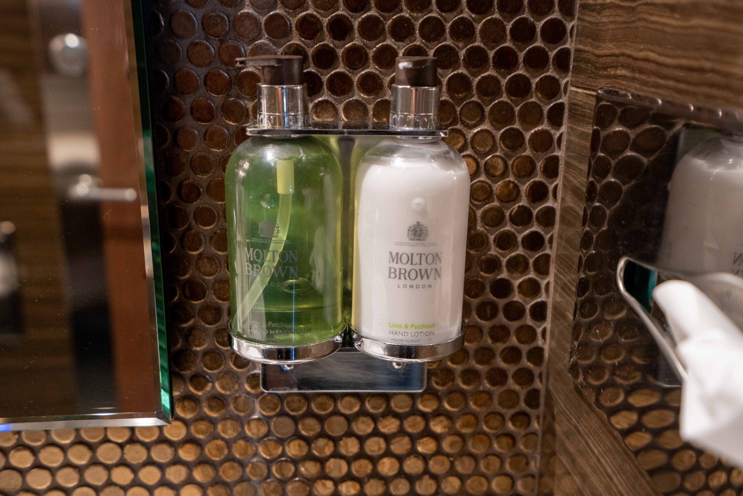 Hand towels are provided in the restrooms, alongside Molton Brown toiletries.