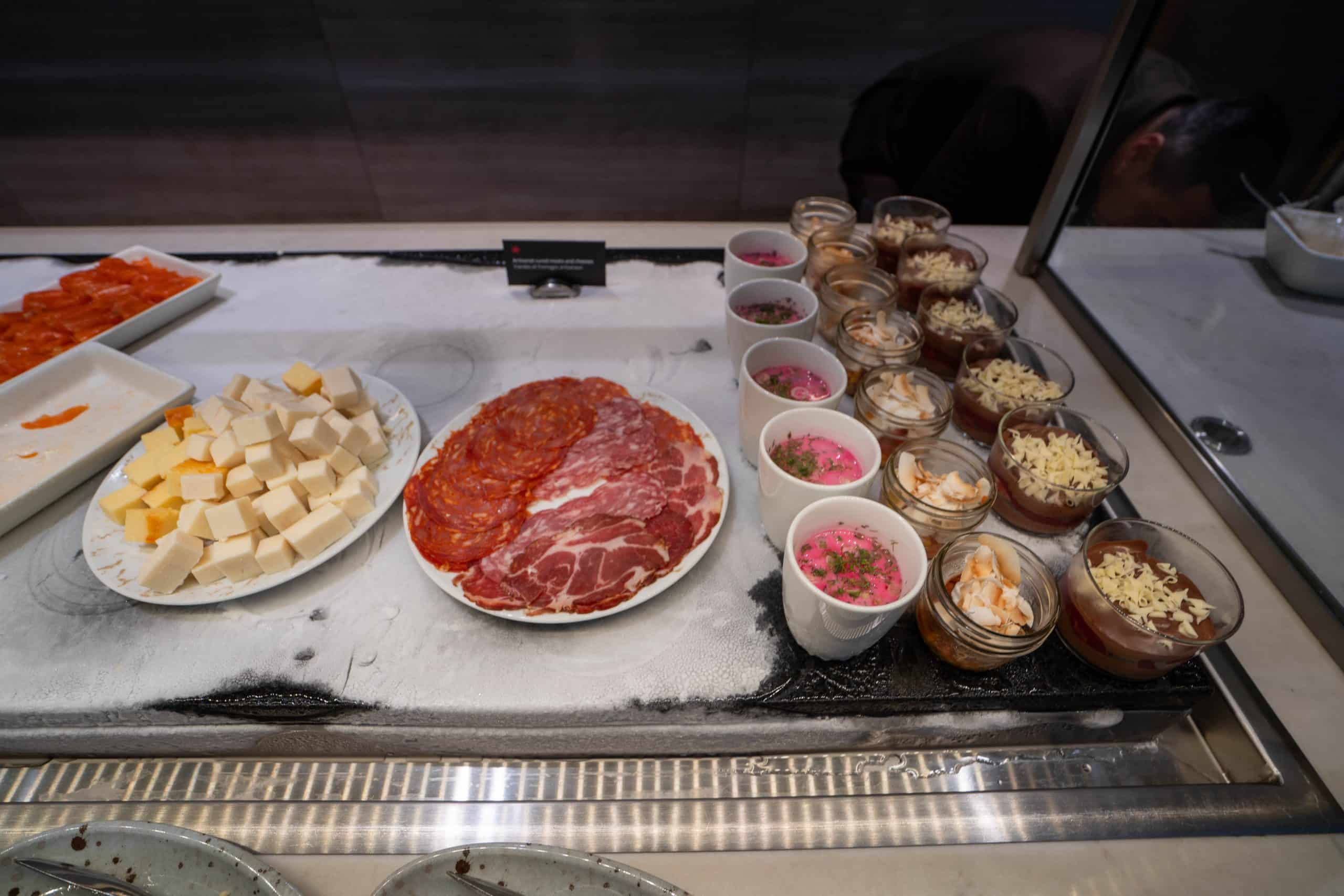 When I visited, the selection encompassed steamed rice and dumplings, grilled vegetables, stew, and a few soups. An assortment of cured meats, cheeses, and smoked salmon were available, as well as a salad bar and a selection of desserts.