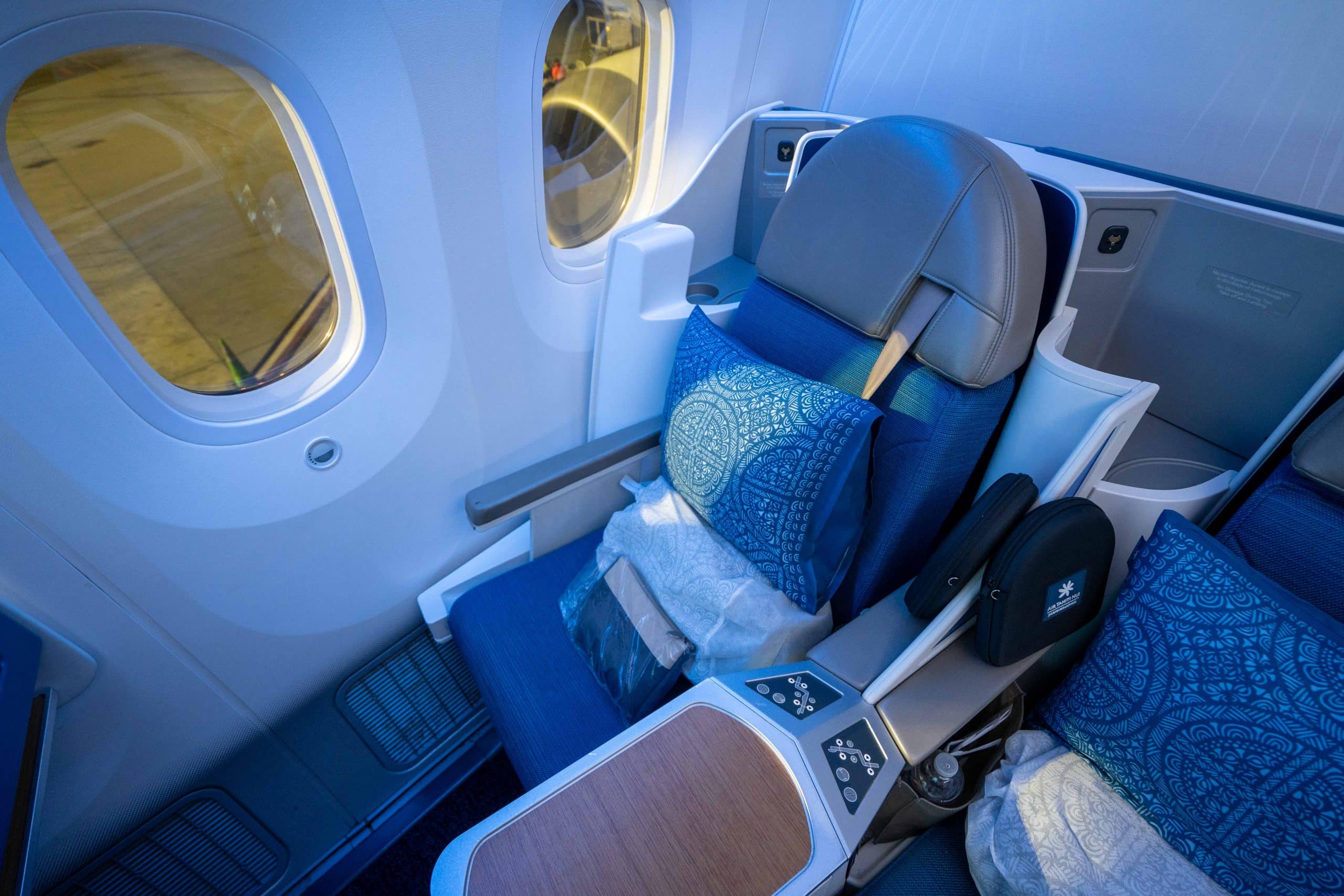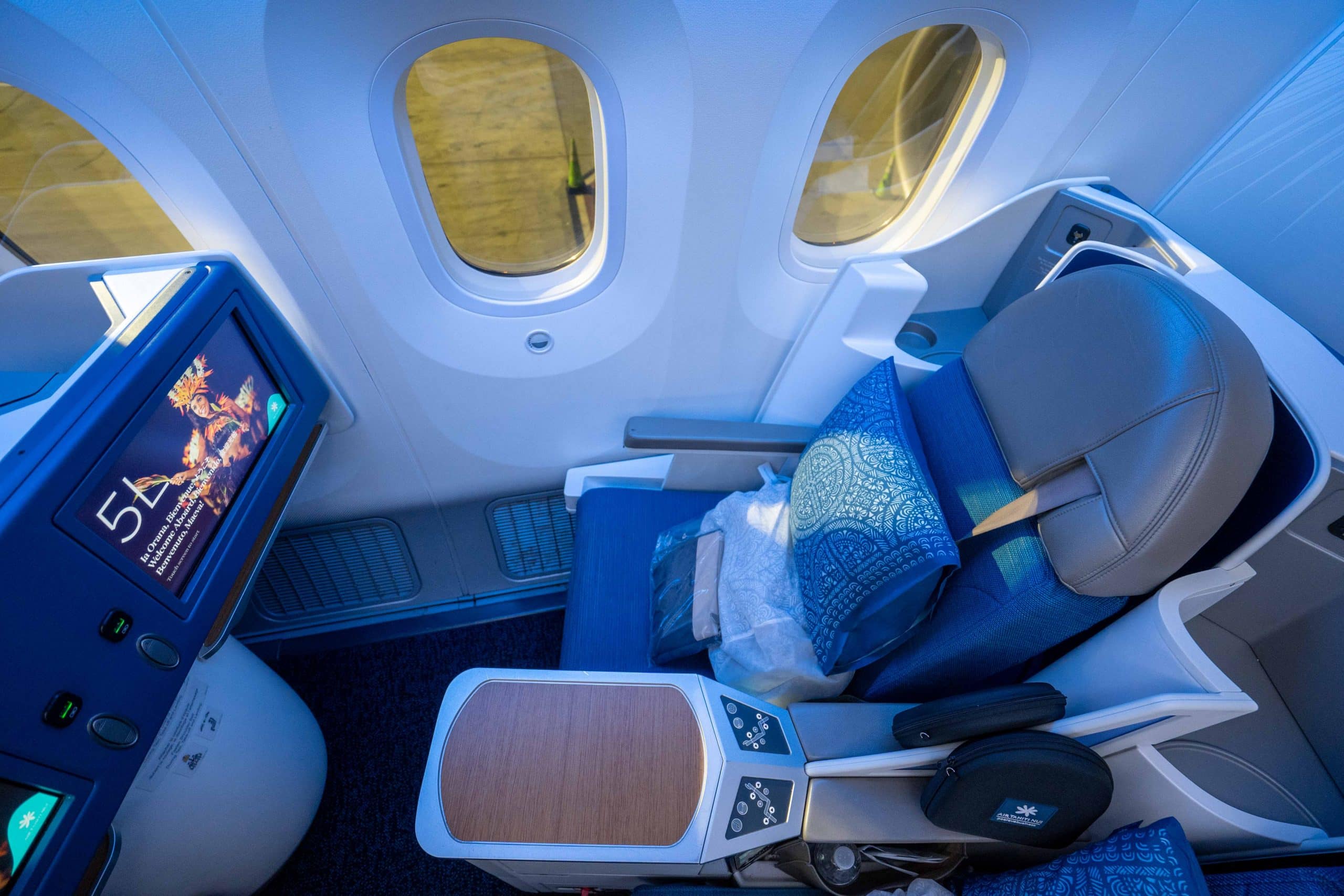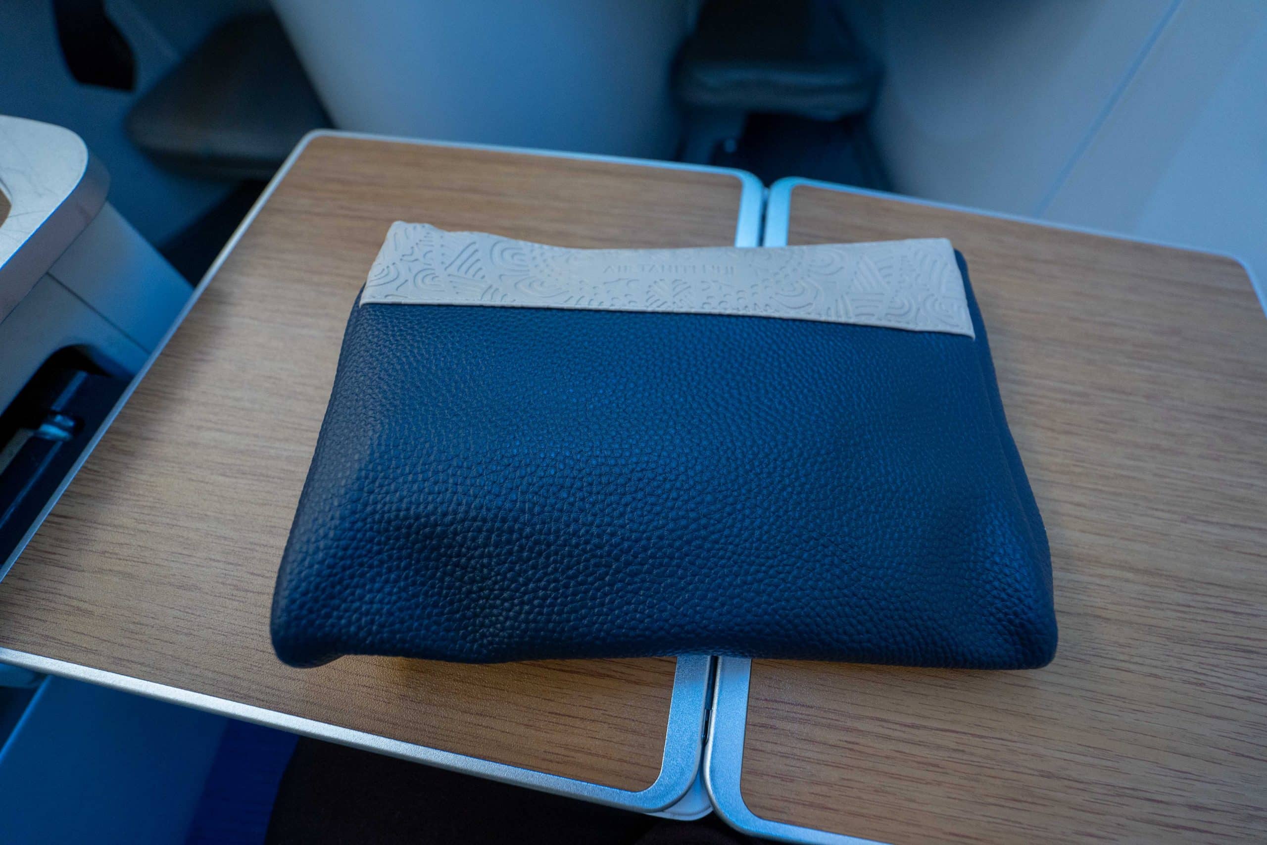 Prior to boarding, a pillow and blanket are placed at each business class seat, adorned with a lovely Polynesian design.