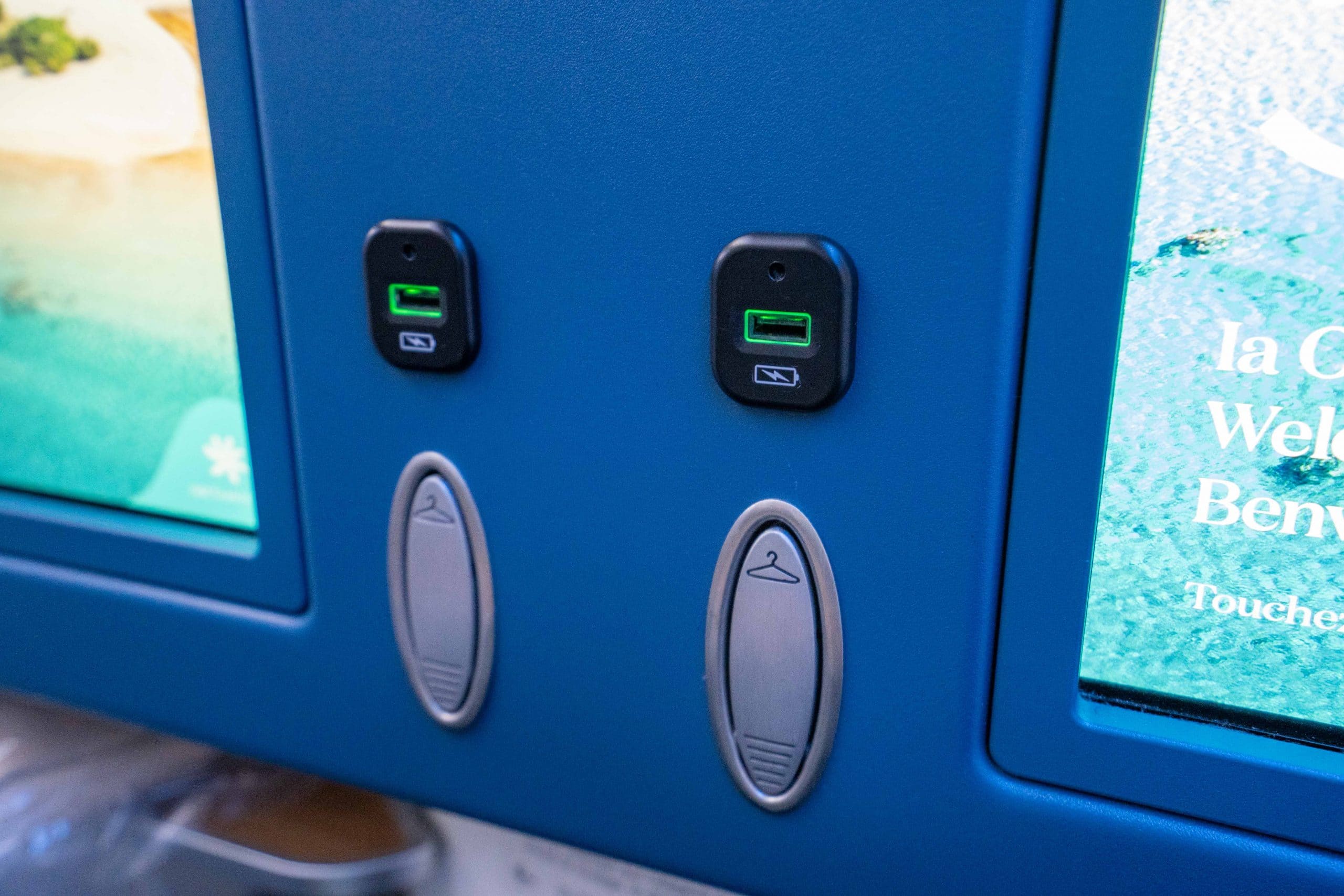 Taking a closer look at the seat, you’ll find a fixed 16-inch high-definition entertainment screen positioned in front of you. Between your and your seat mate’s entertainment screen, there are USB-A ports and coat racks.
