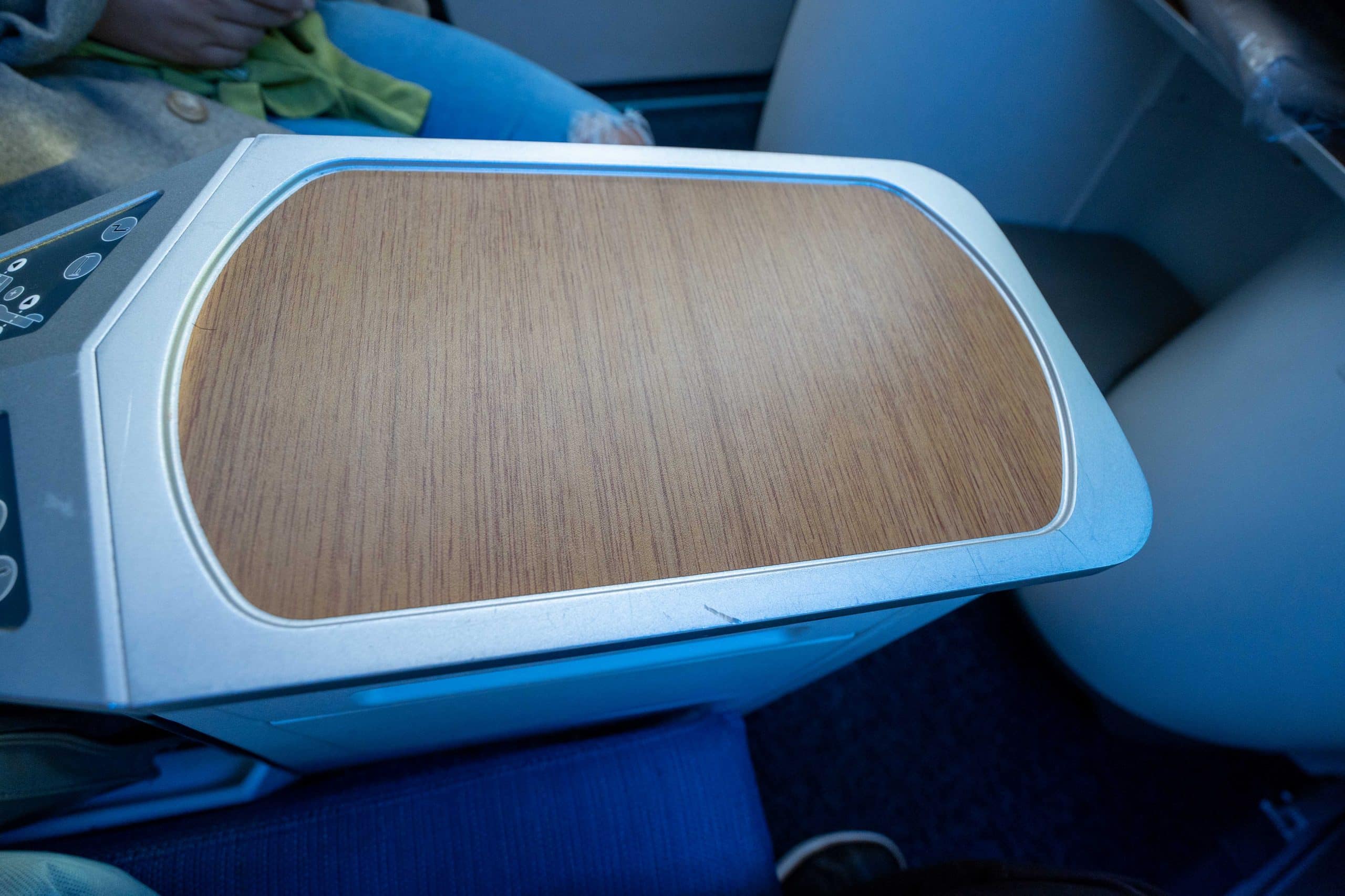 Lastly, the tray table unfolds from the centre armrest at an angle and folds out into position.