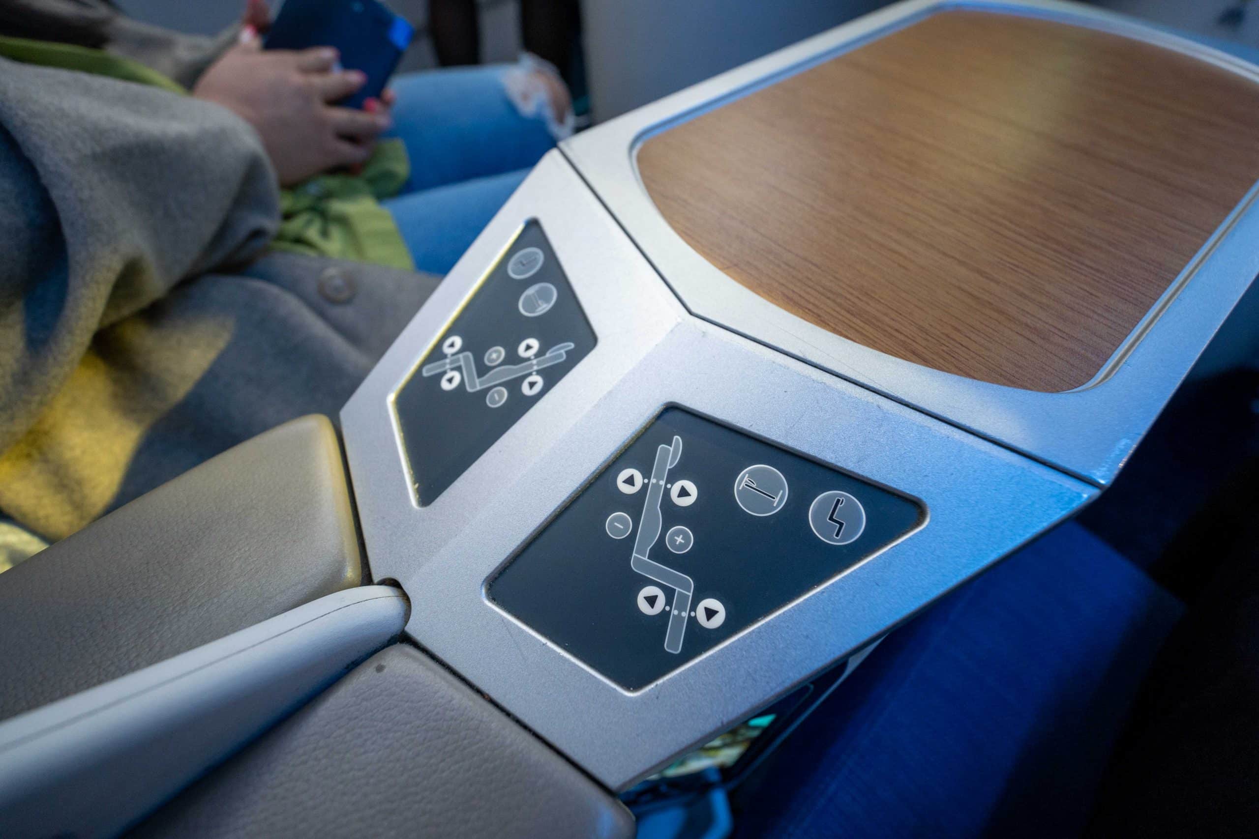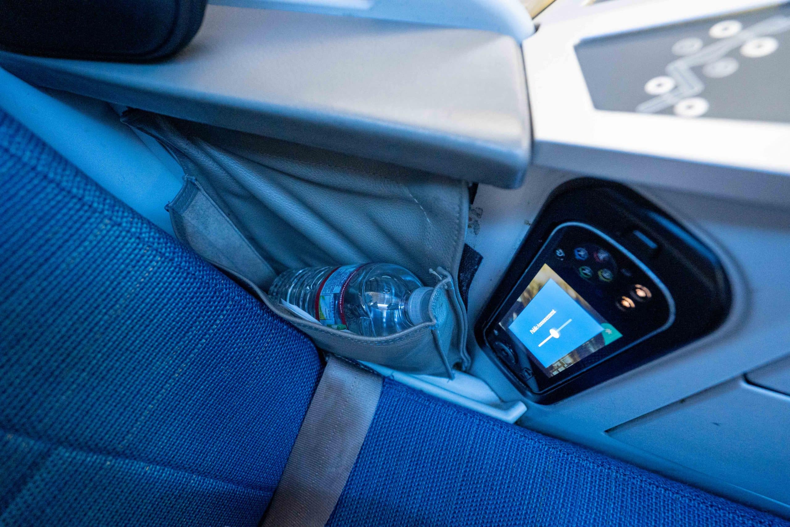 Nestled on the vertical surface of the console is the entertainment controller, which can be easily withdrawn for handheld use. There’s a small pocket adjacent to the entertainment controller, equipped with a bottle of water.