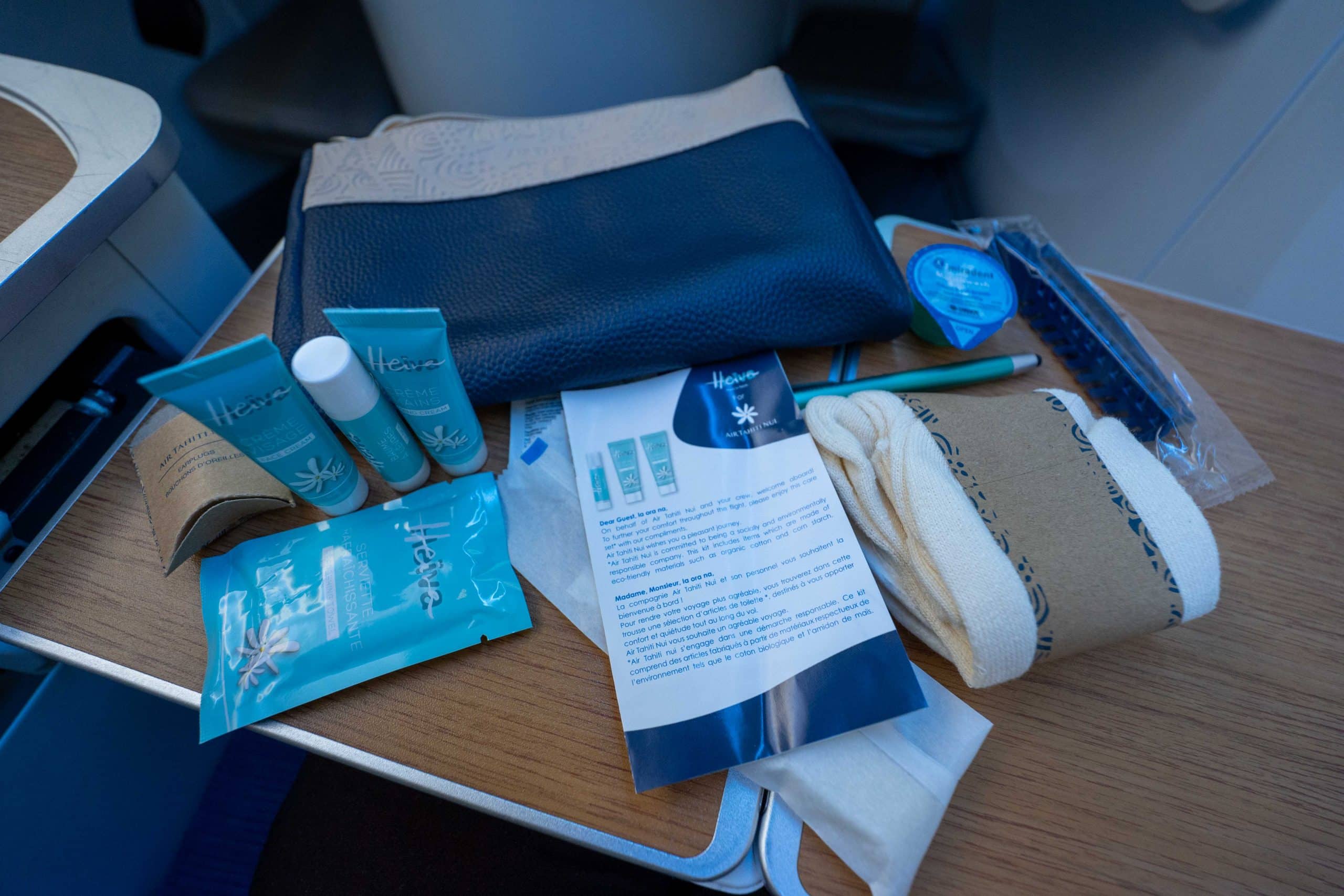 To match their visual identity, Air Tahiti Nui offers a well-stocked beige and blue leather amenity kit. Opening the kit revealed a carefully curated selection of eco-friendly items, including a toothbrush and bamboo fibre socks.