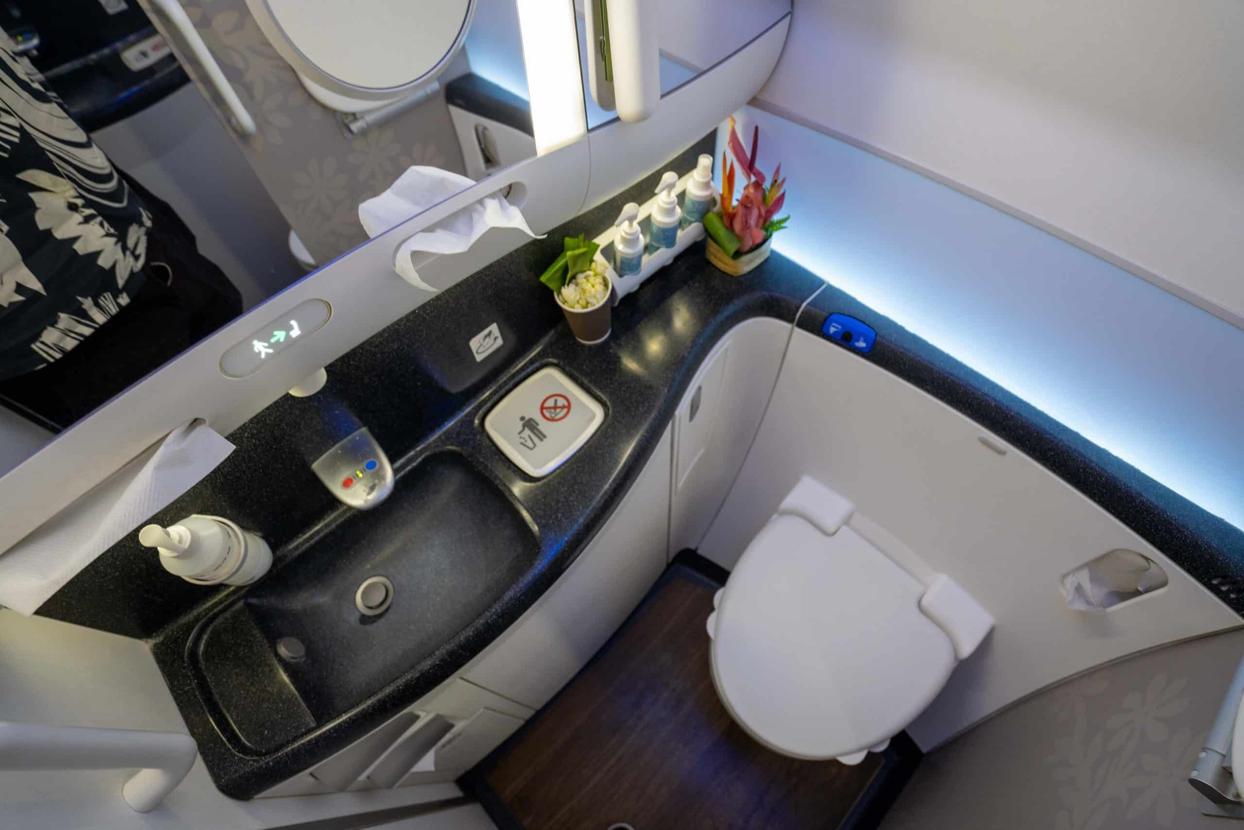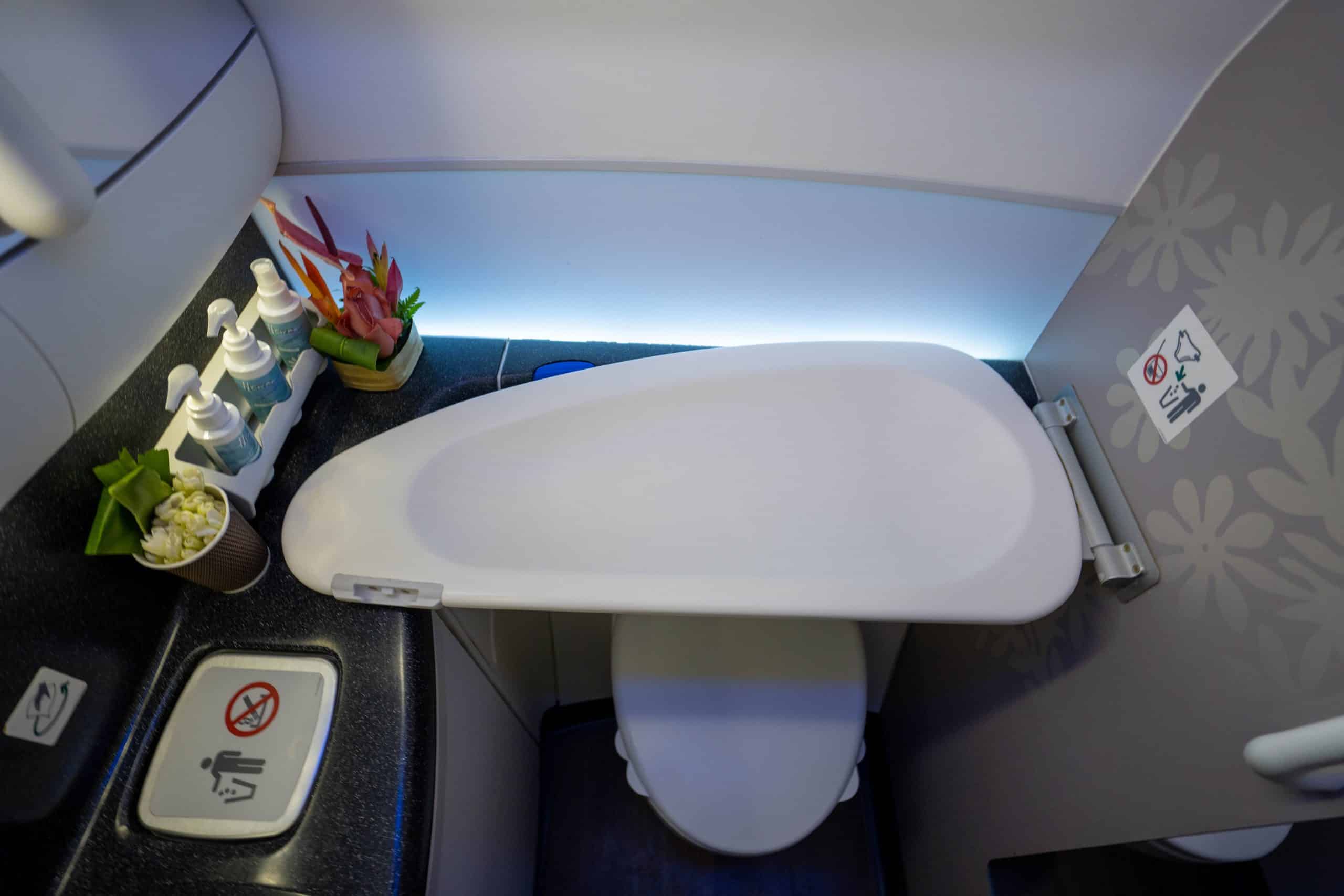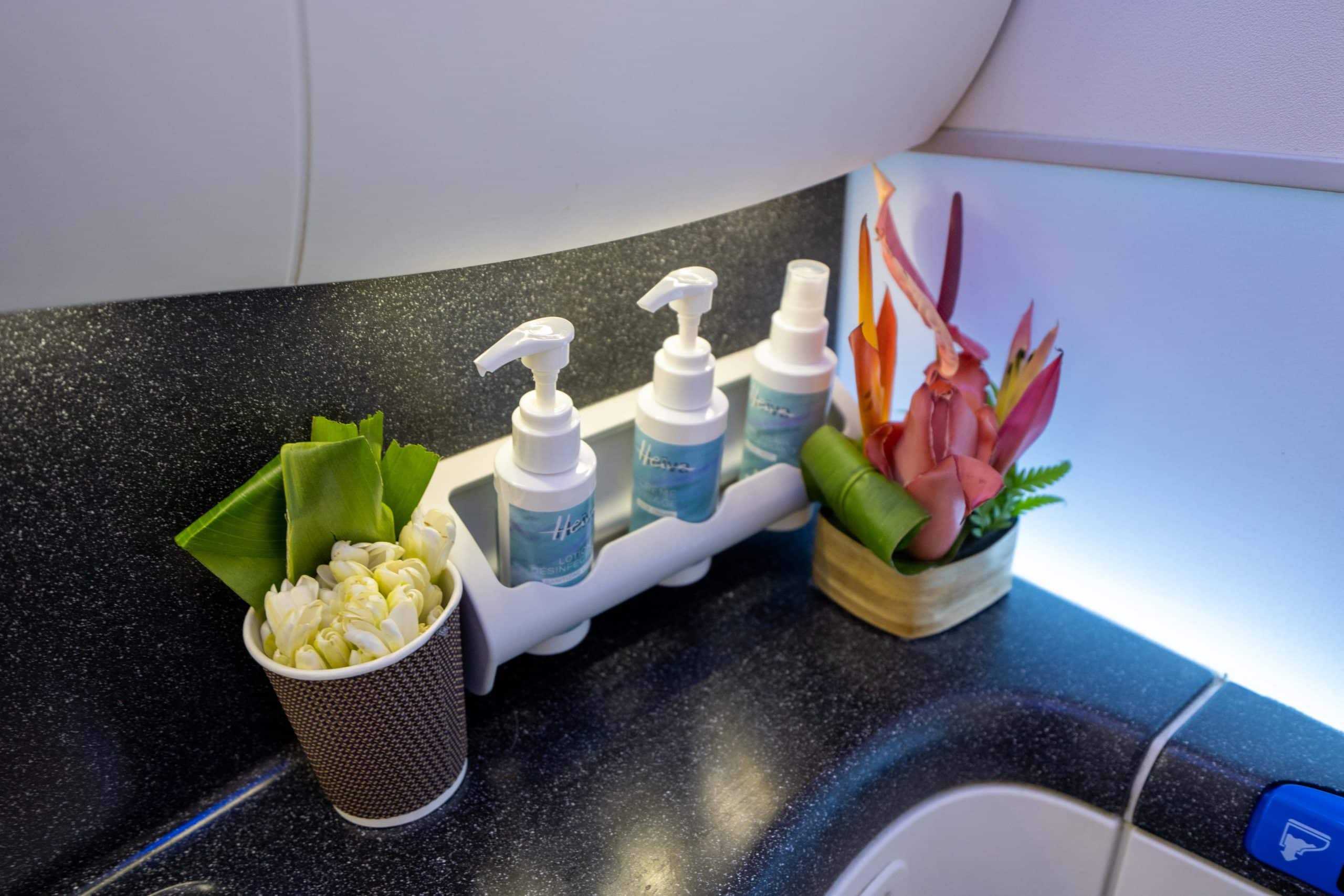 The restrooms follow the standard design of the Boeing 787, complete with a fold-out baby changing station above the toilet. Additionally, Air Tahiti Nui has added a pleasant touch by incorporating flower arrangements and providing Heiva amenities in the restrooms.