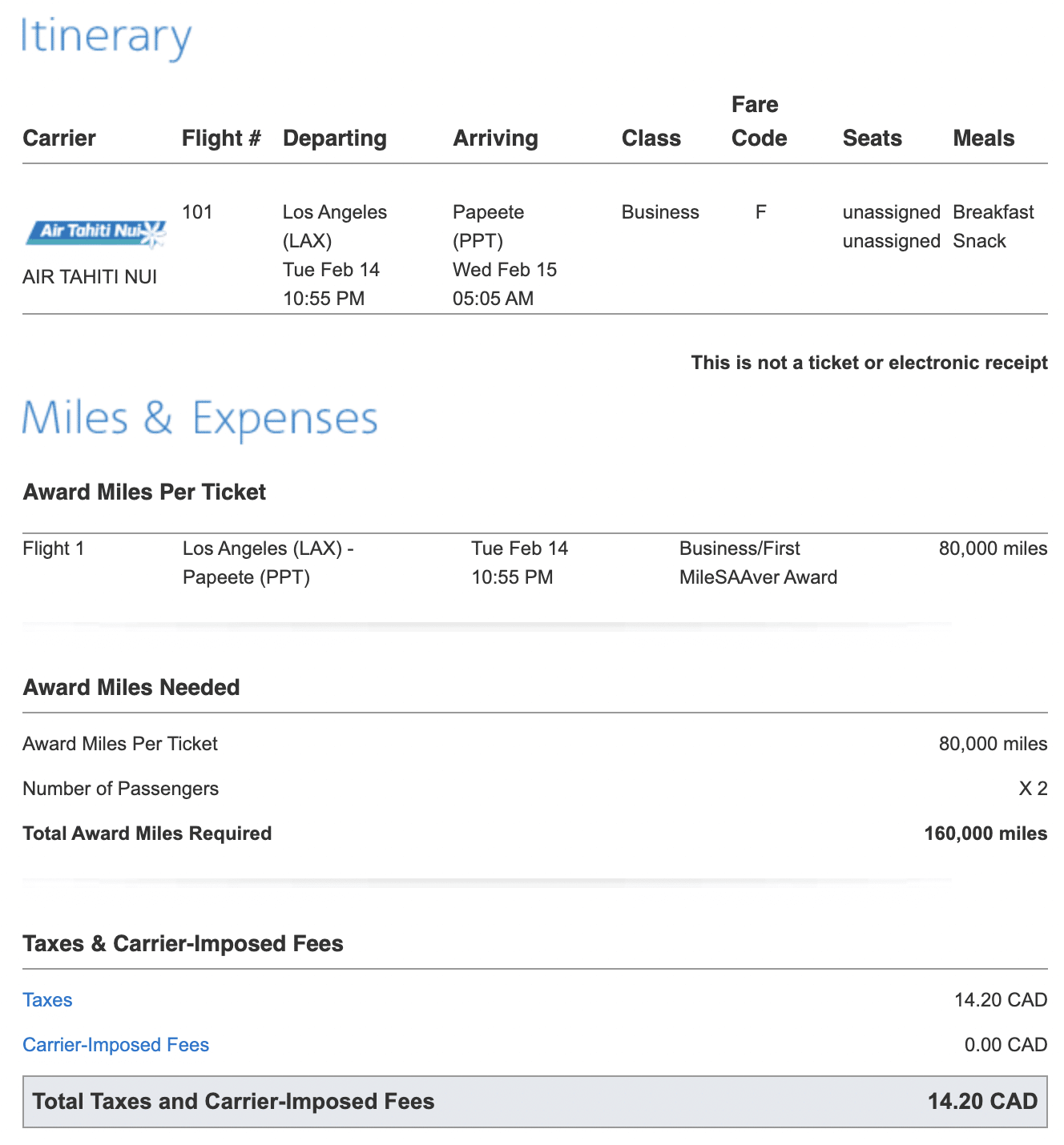 Securing a direct flight from North America to French Polynesia poses a unique challenge, particularly when seeking premium cabin options using miles. However, with careful and advanced planning, we were able to book two seats in business class successfully.