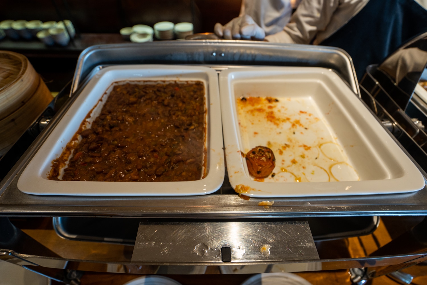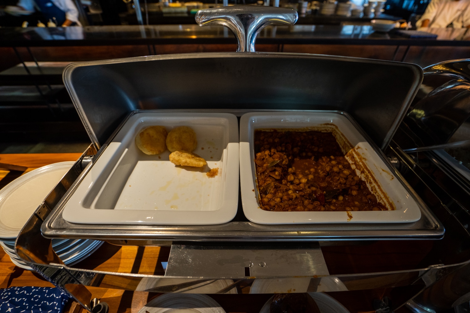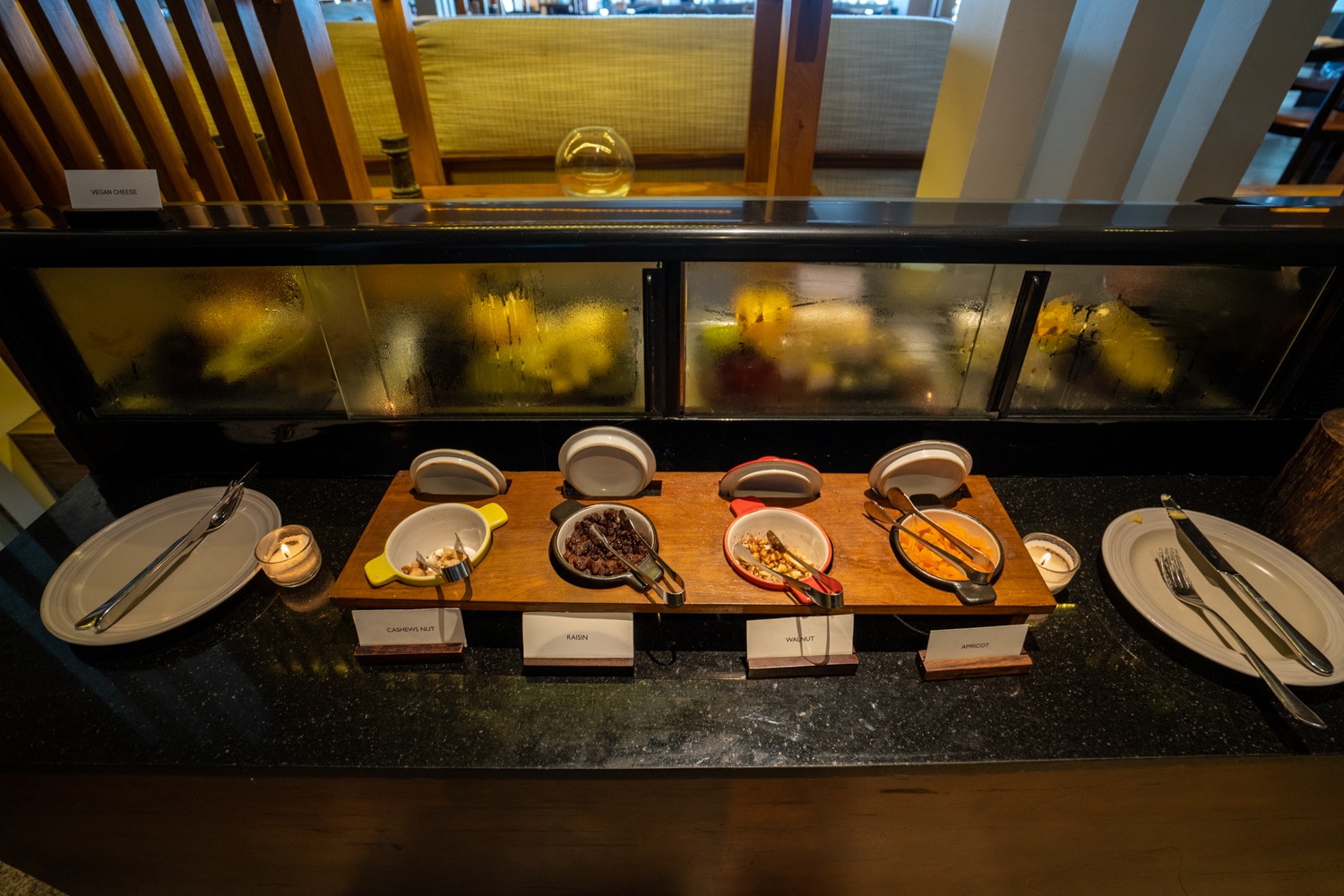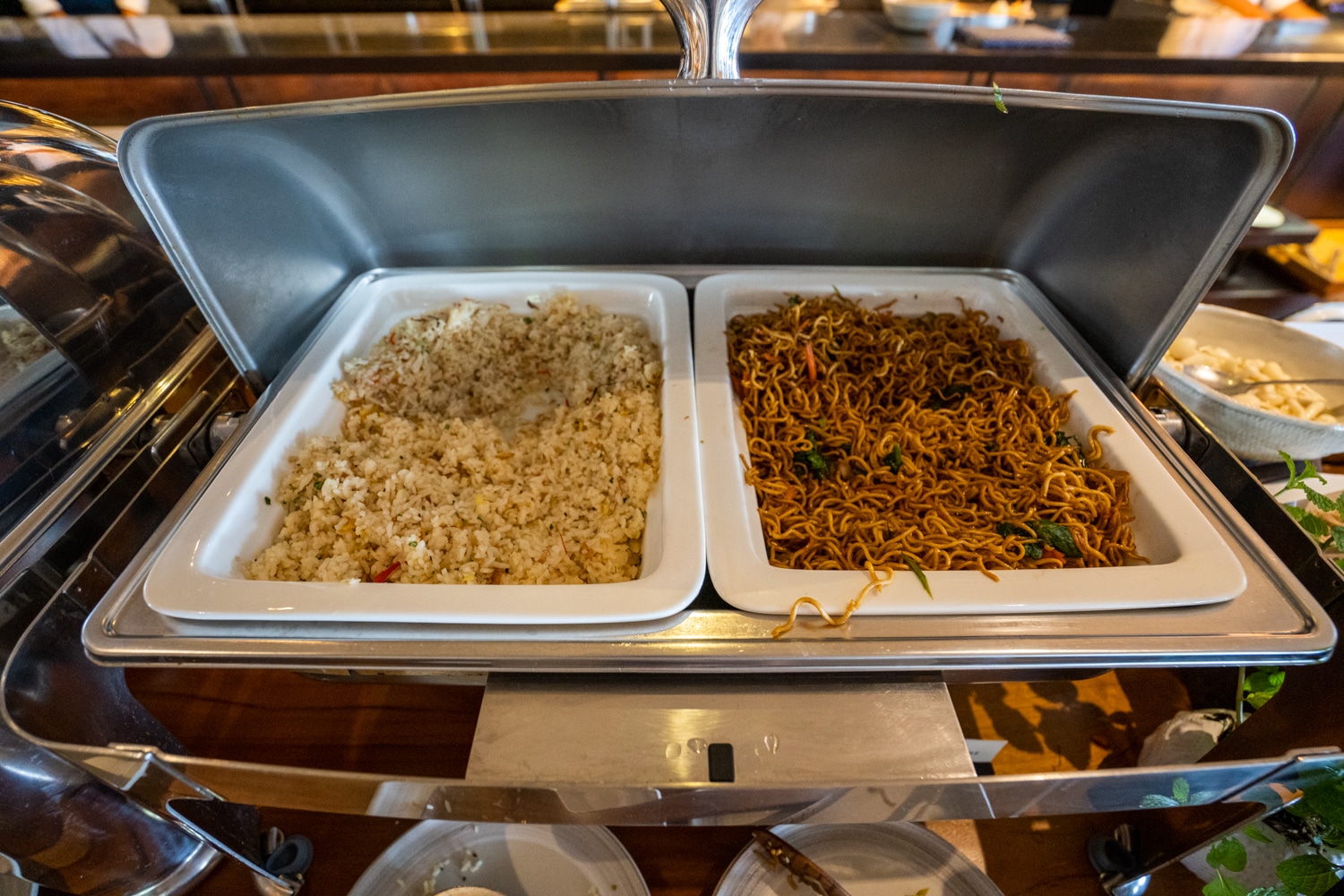 Western items like sausages, beans, and grilled tomatoes were available, along with made-to-order eggs, boiled eggs, and eggs Benedict. A selection of vegan cheese and toppings was also provided.