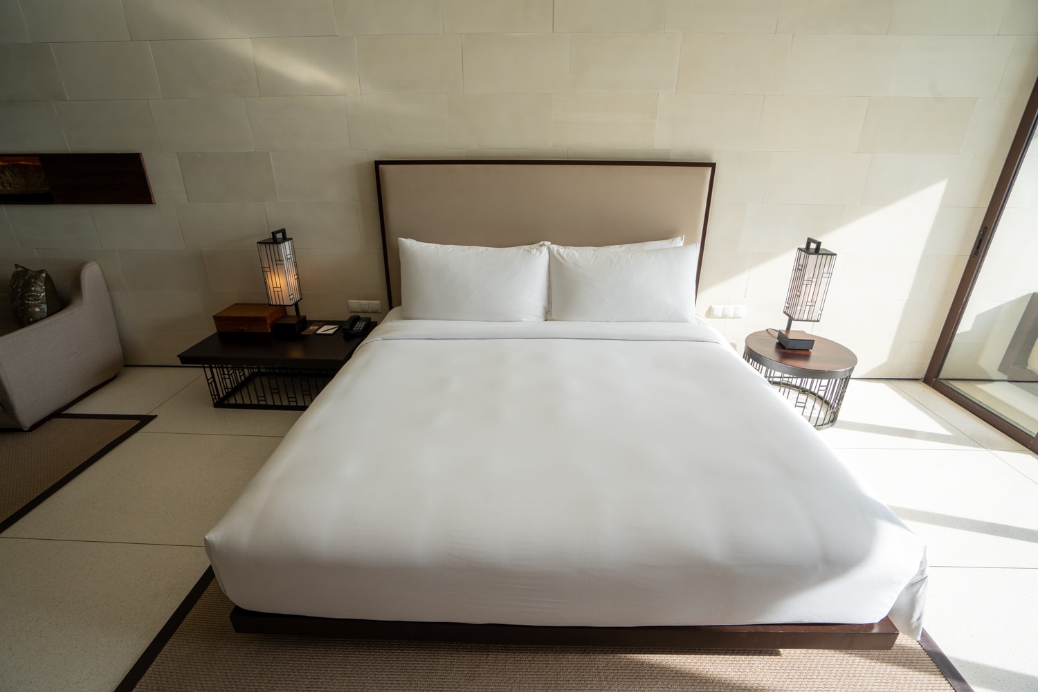 As you make your way towards the king bed, USB charging ports and power outlets are conveniently located on the large wooden side tables flanking the king bed, while lighting controls are well within reach.