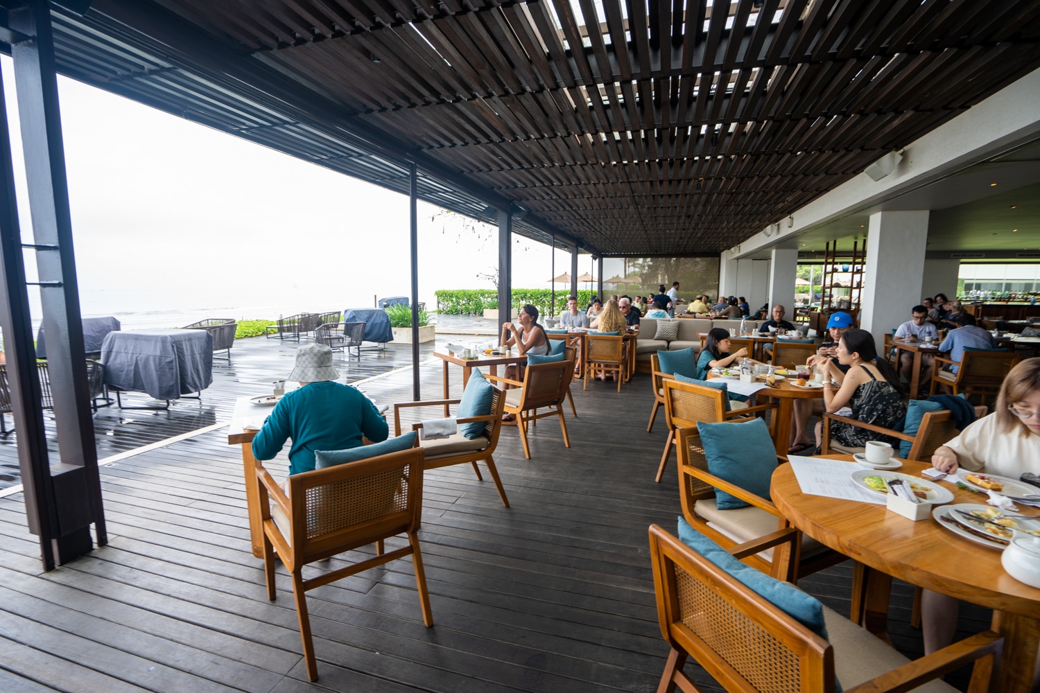 There’s a large indoor air-conditioned seating area for couples and larger groups, as well as a beautiful terrace with ample seating that overlooks the ocean, complete with a few lounging chairs.