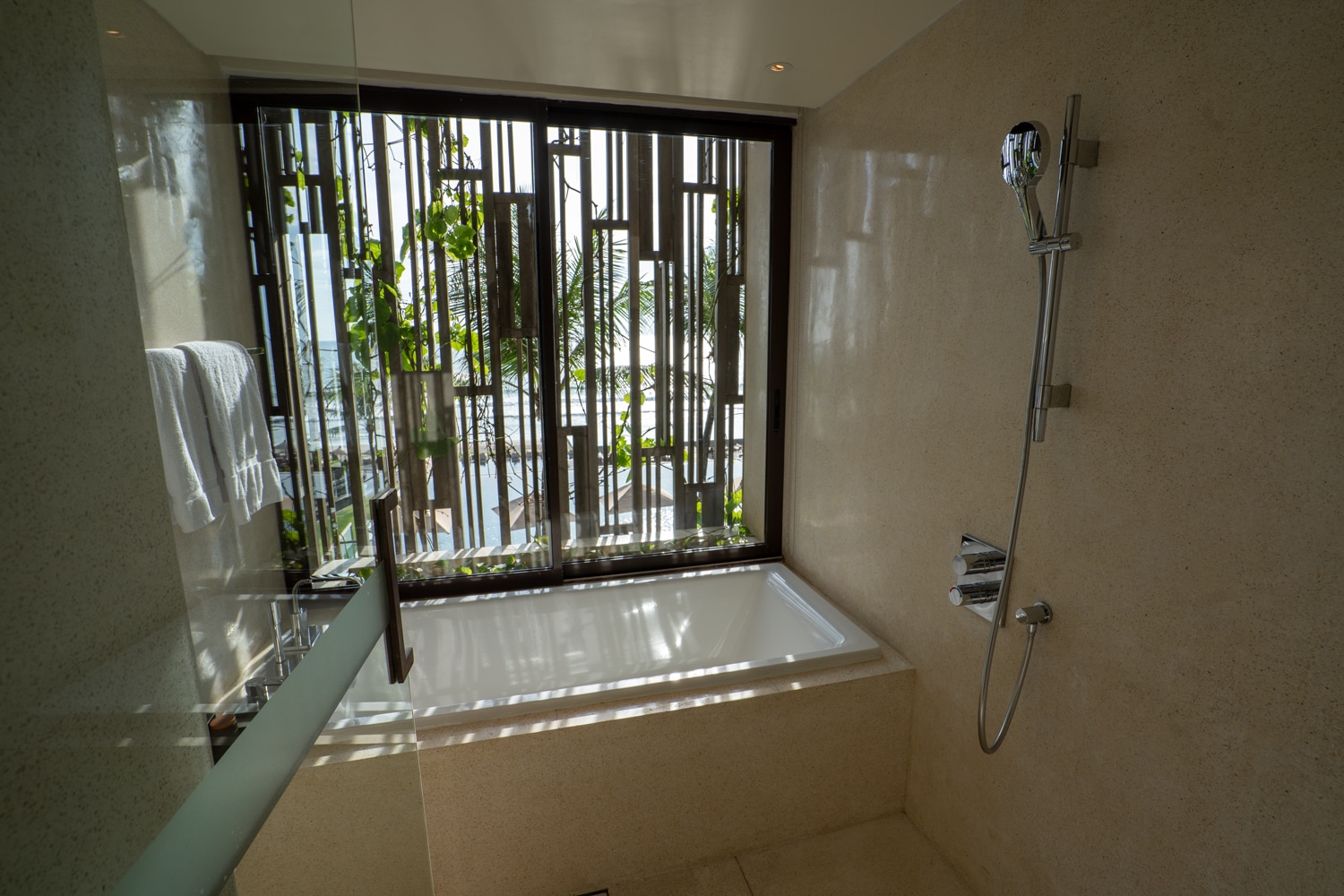 A separate wet room with a shower and bathtub is positioned next to a vertical timber screen, offering a private sanctuary where you can soak in breathtaking views of the ocean while still retaining privacy.