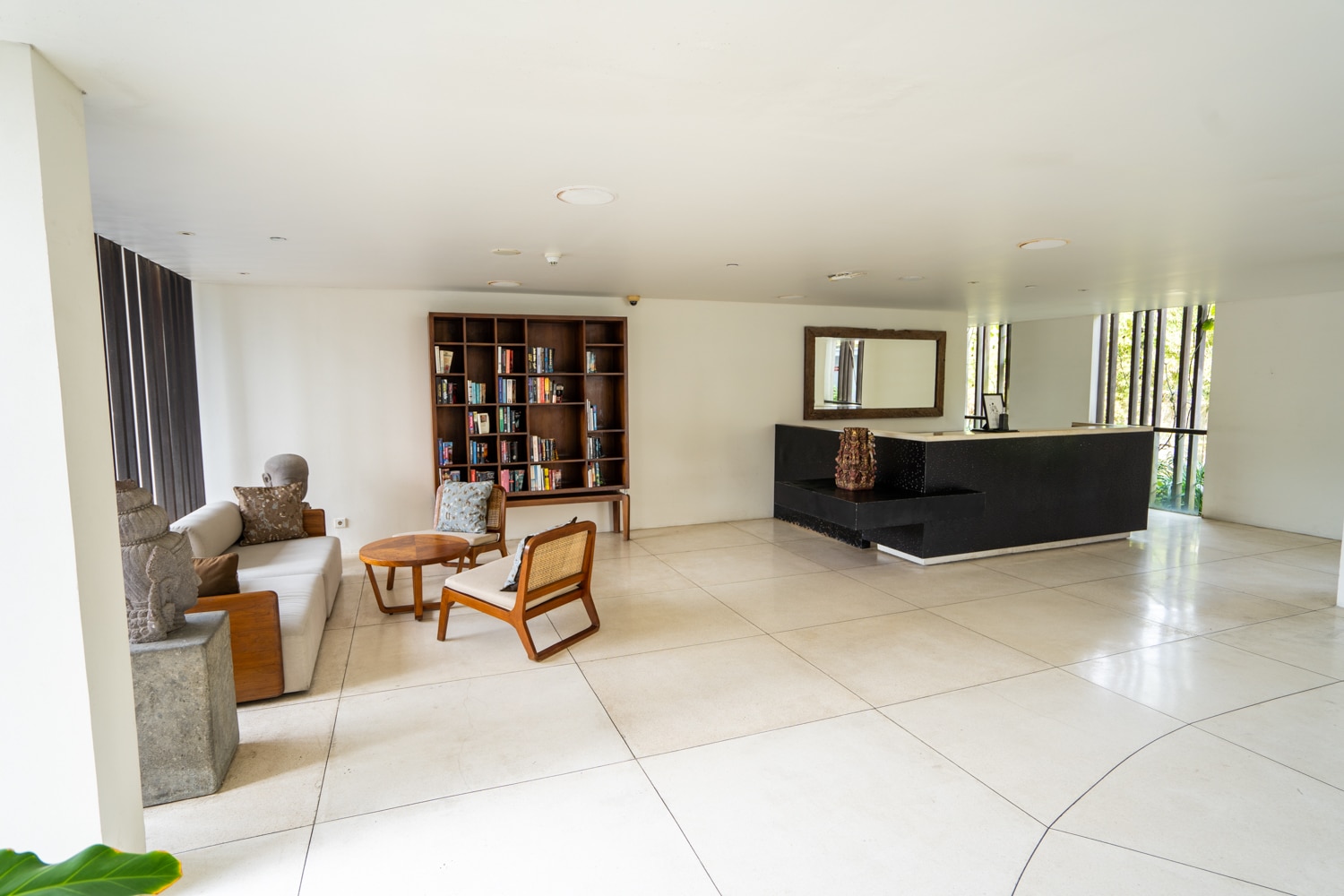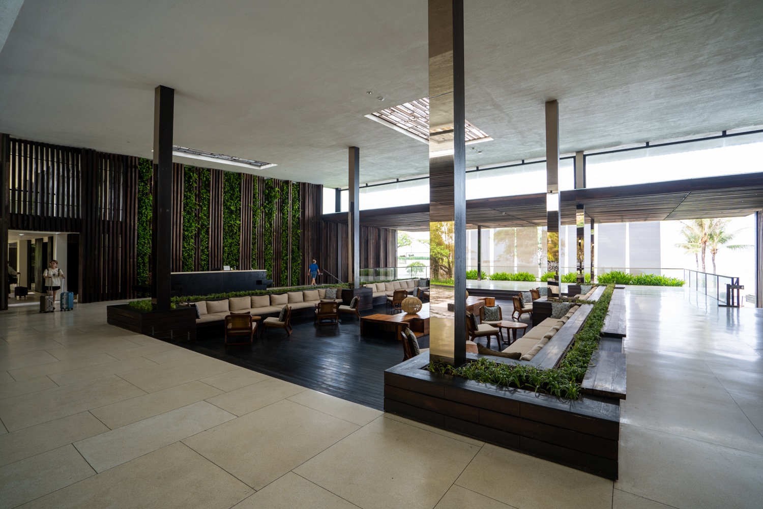 There is plenty of seating in the centre of the lobby, including plush benches and individual chairs. Additionally, two reception desks are positioned on the left and right sides of the space, both framed by a stunning backdrop of lush tropical foliage.