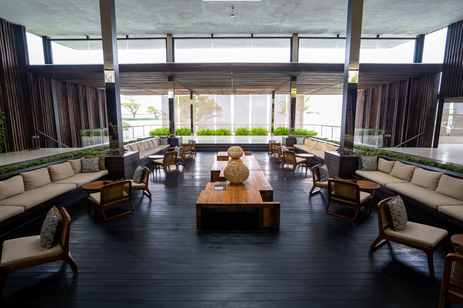 At the front of the hotel, a covered entrance area welcomed me with a striking wooden ceiling made from locally sourced teak wood, which transitions into an open-air lobby with panoramic views of the hotel’s pools and ocean.