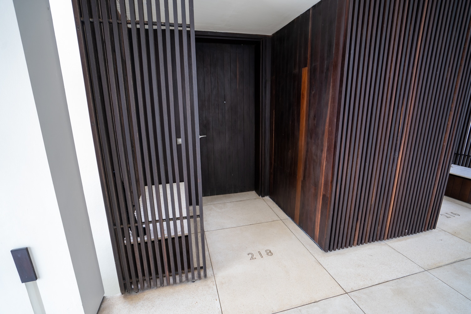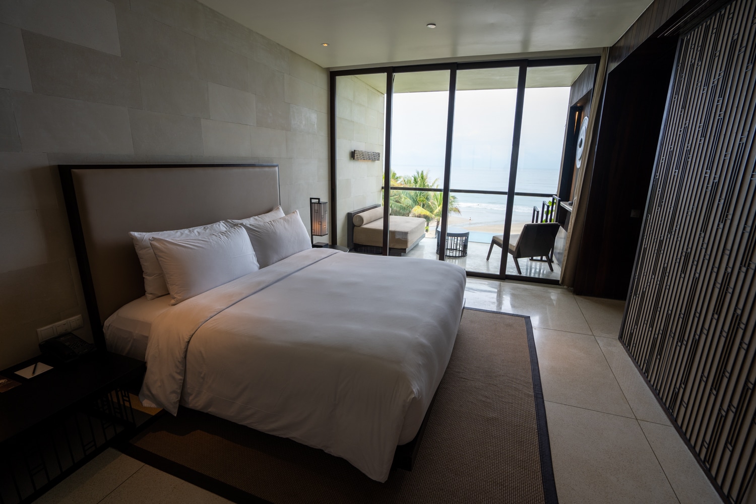 Overall, the Alila Ocean View Suite features a beautiful minimalist aesthetic, with dark brown wood, white walls, and floors accented by plenty of beige tones.
