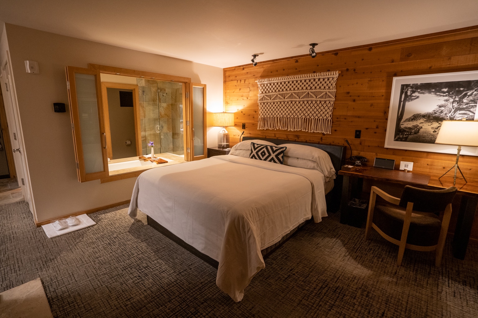 The artwork in the room varied from a hand-crafted macramé above the bed to black-and-white photographs of the surrounding landscapes.