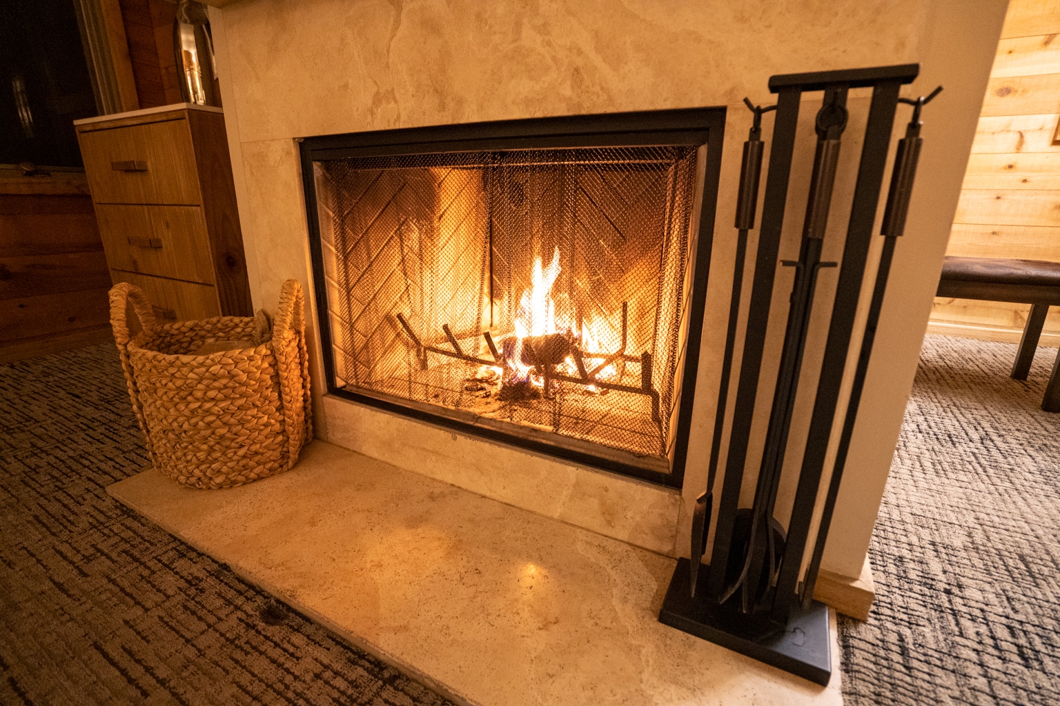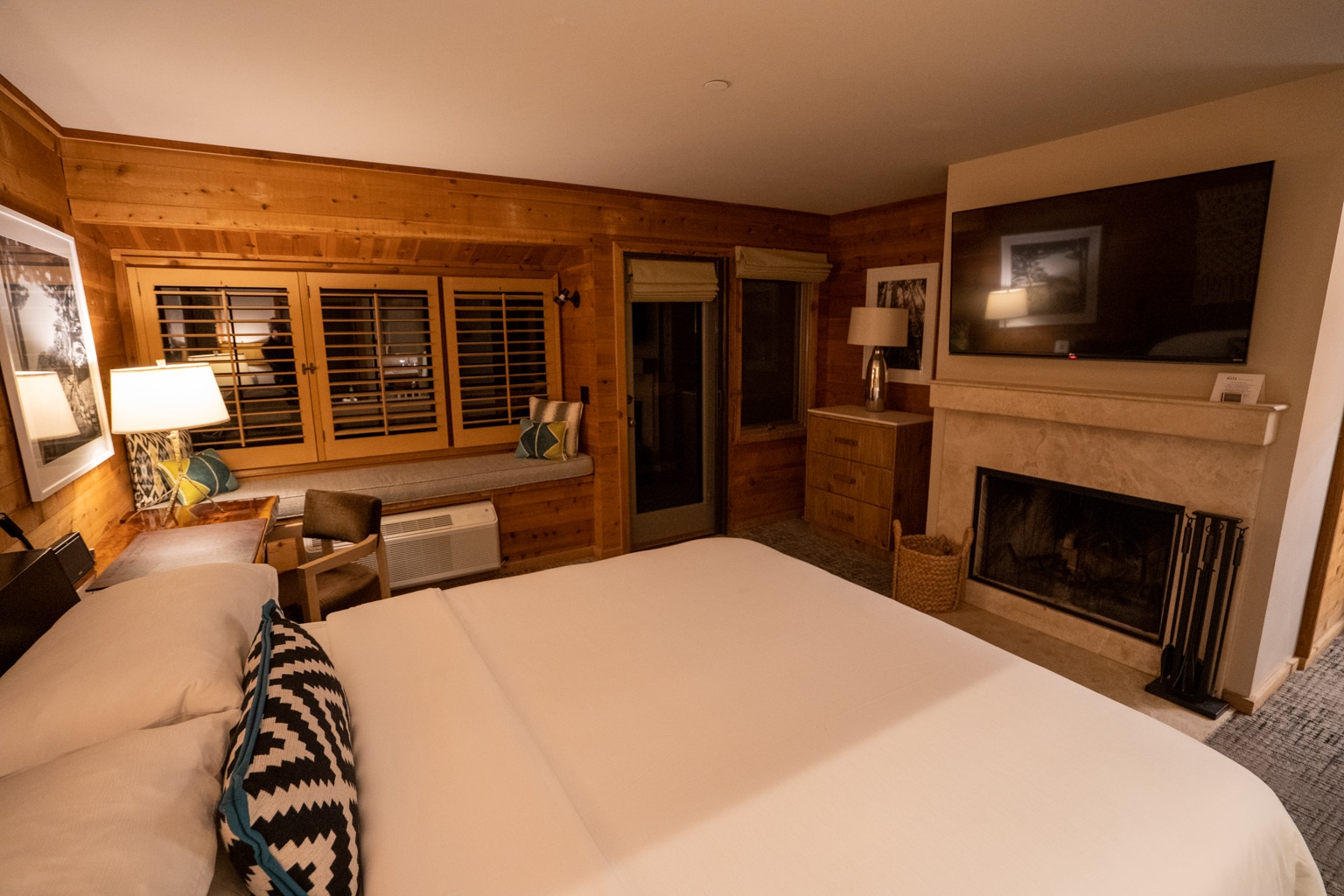 Heading back inside, the king bed faced a stone-wall wood-burning fireplace, and the room came with straw bags of firewood that we could use to keep a fire going. Mounted on the wall above was a large flat-screen TV.
