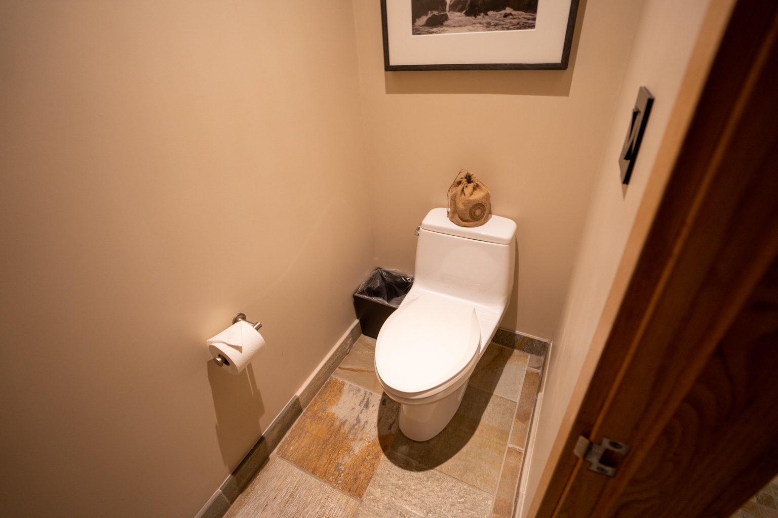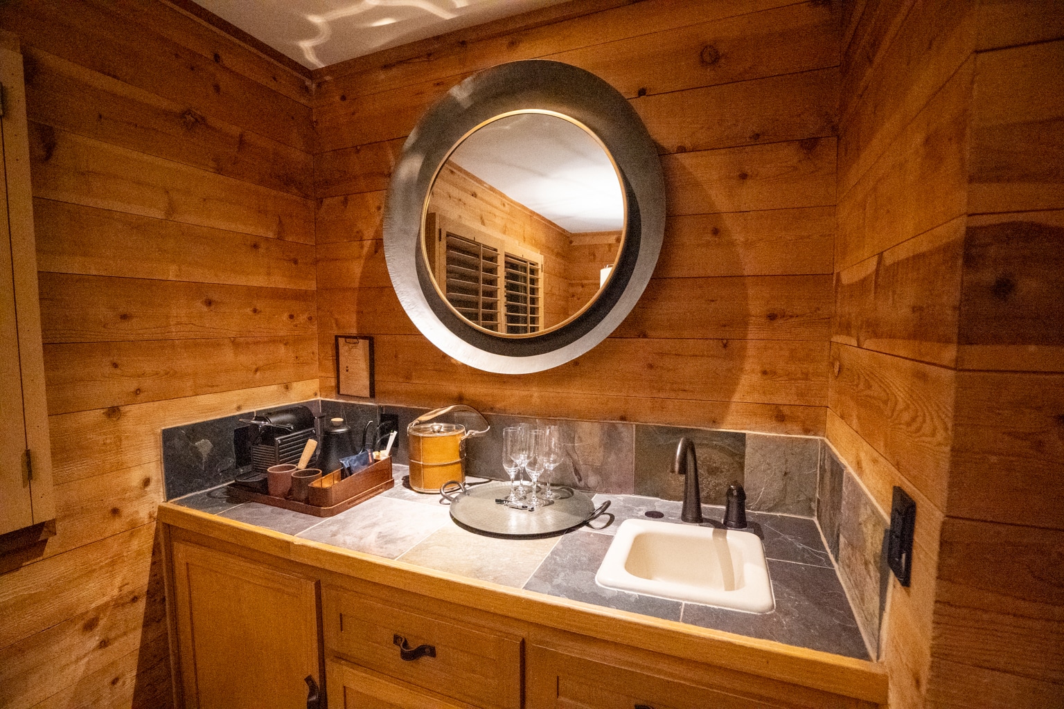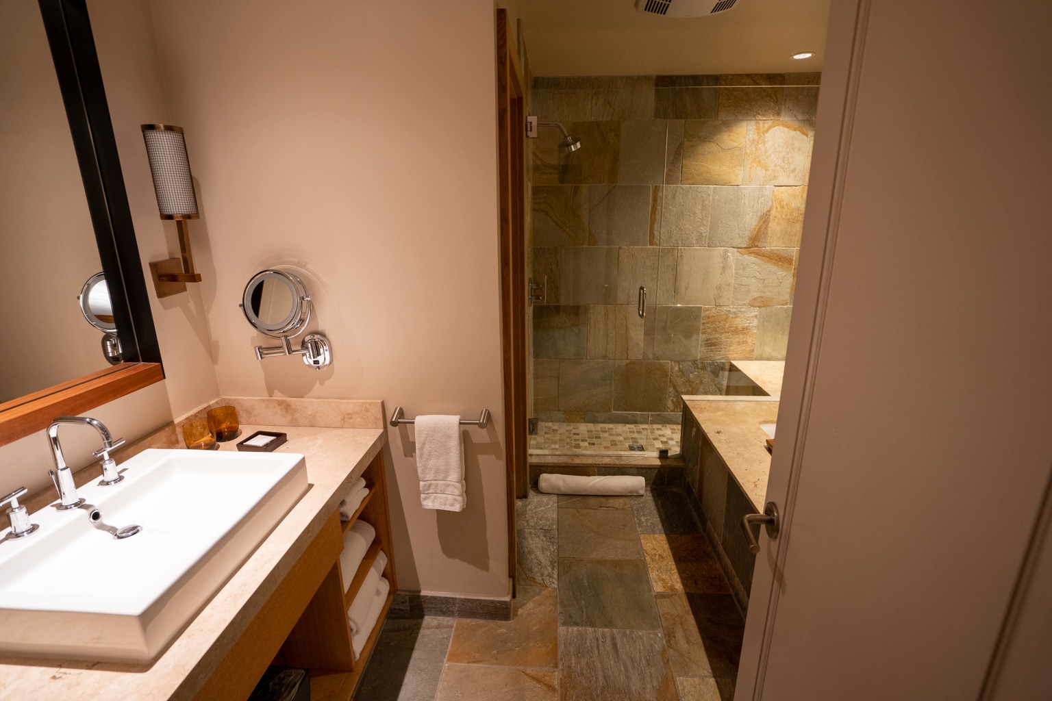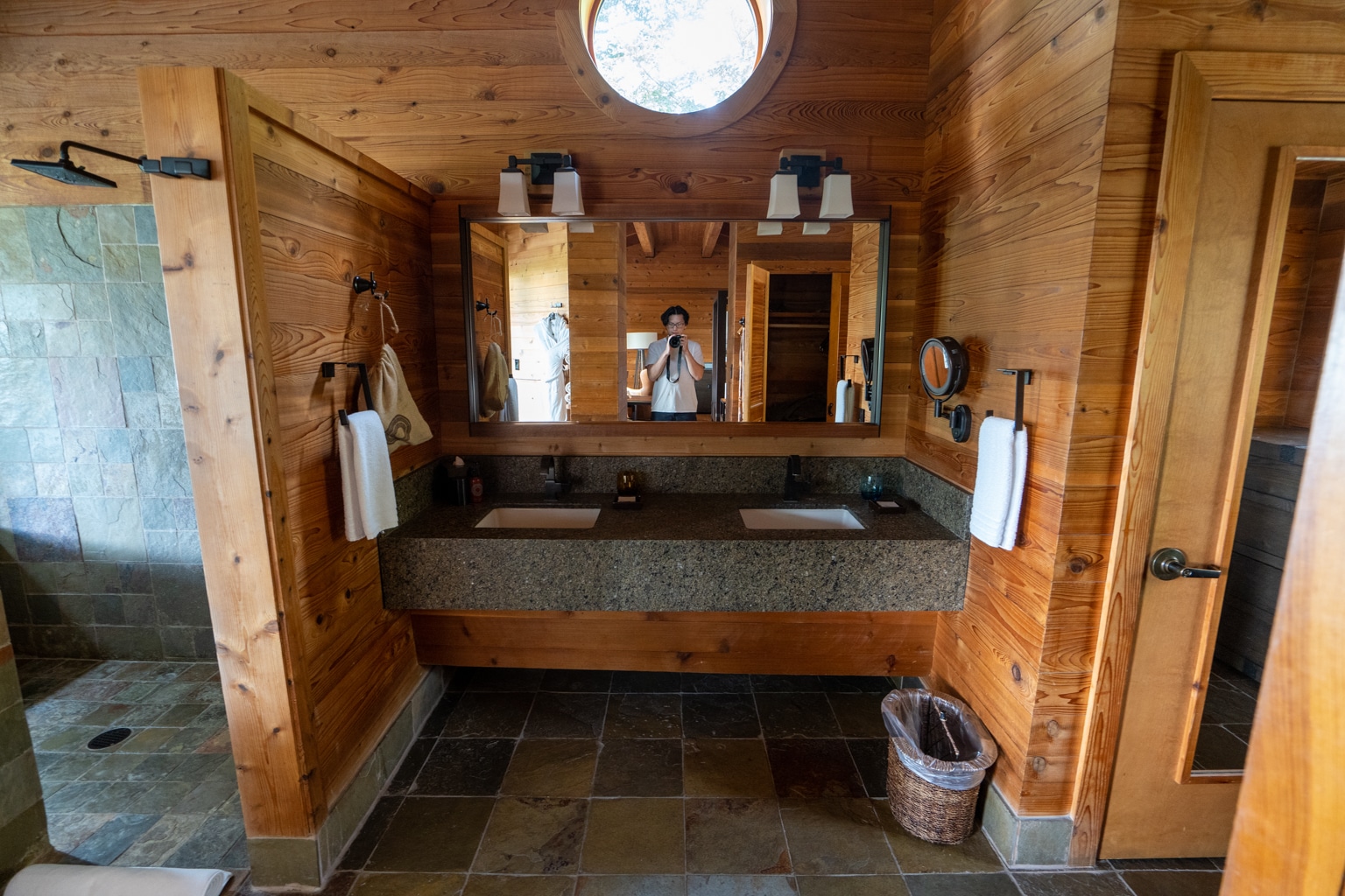 The bathroom finishes continued along the rustic luxury themes, consisting of cedar wood incorporated into the trim of the mirror and vanity shelving, marble for the countertops, and natural stone tiling for the floor and walls of the shower walls.