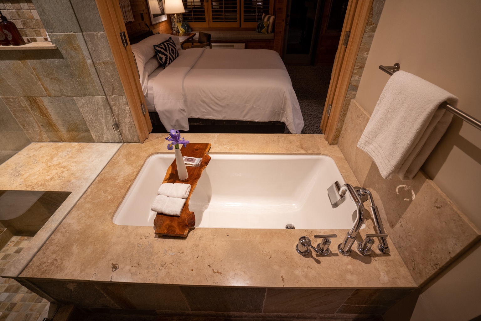 This suite’s fireplace was designed with an exposed natural stone compared to our first room’s smooth, stone-wall fire. The flat-screen TV was mounted on the wall above the fireplace.