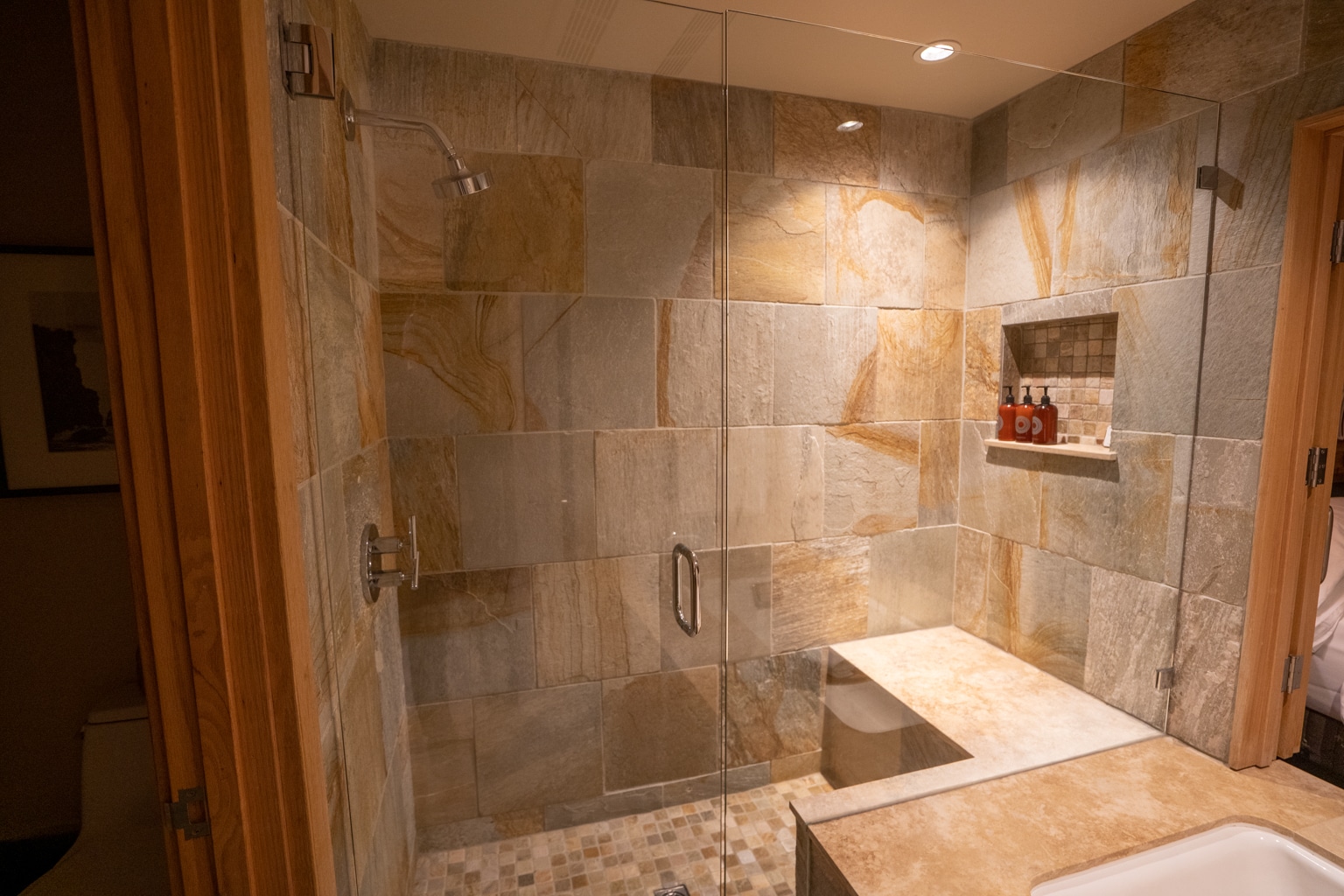 At the foot of the tub was a walk-in shower with a good water pressure, along with a bench to sit and relax as the water splashed around you.