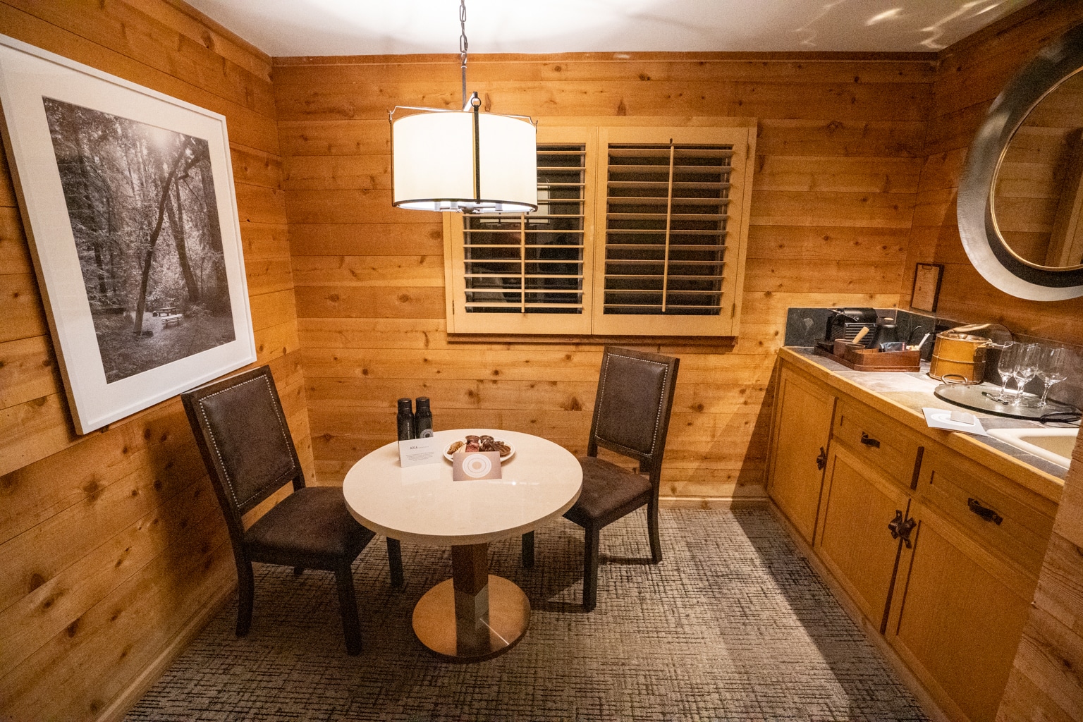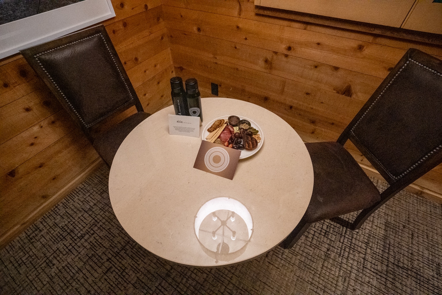 The dining table had two leather chairs, and on top was a small charcuterie plate with sparkling wine as a welcome gift.