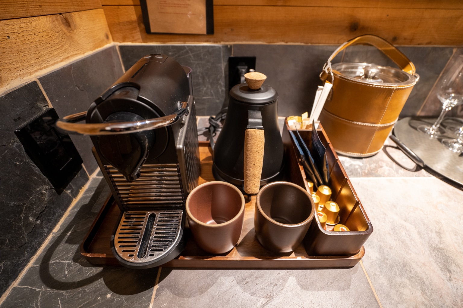 As you enter the room, you’ll find a fully stocked minibar and refreshment counter alongside the dining area. A Nespresso coffee machine, tea, and refillable water bottles are found on the counter.