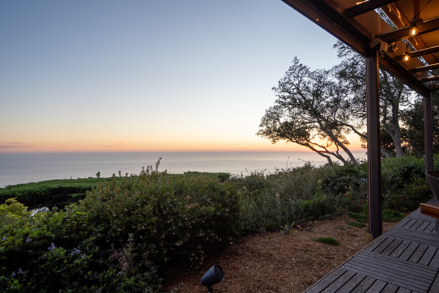 Outdoors you can find a tented seating area, comfortable couches surrounding a fire pit, and a terrace with awe-inspiring views overlooking the Pacific Ocean.
