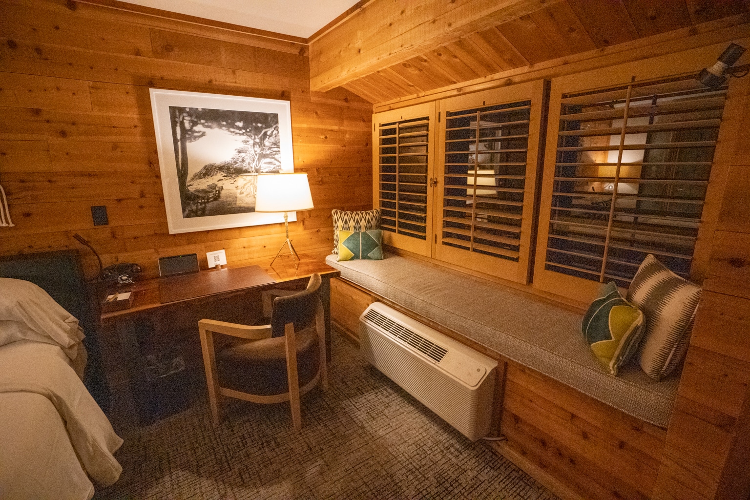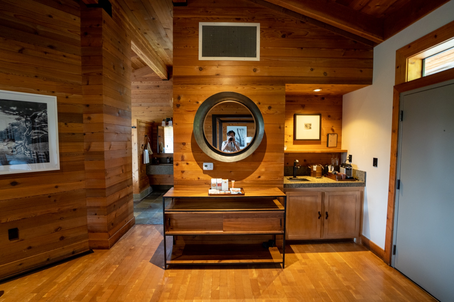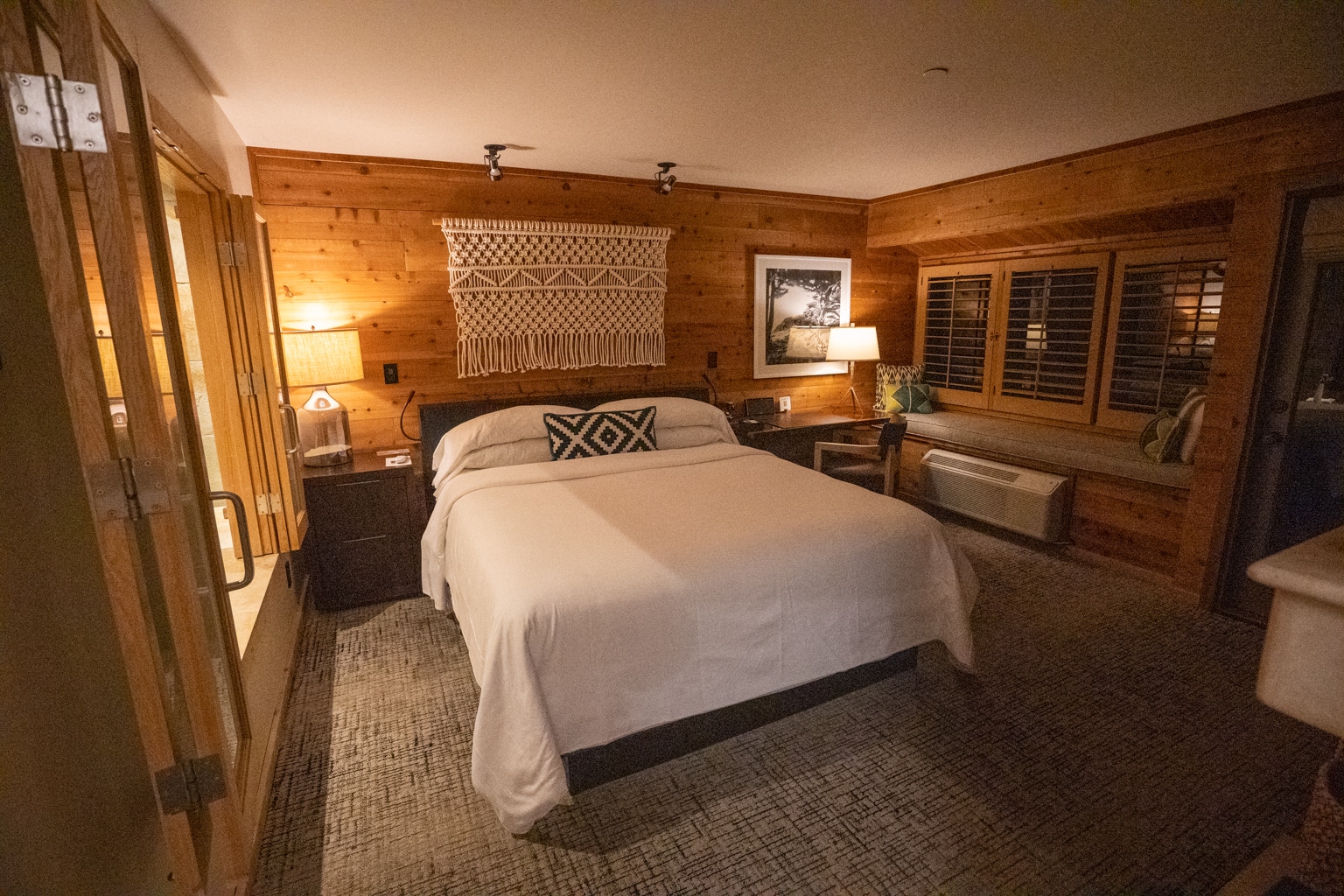 While the first room merely incorporated cedar-planked wall accents, this suite was almost entirely wooden walls and flooring. The wooden beams along the top of the ceiling created an authentic cabin-like atmosphere.