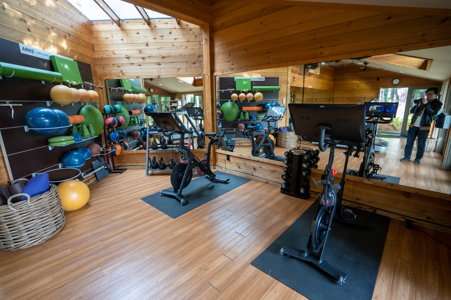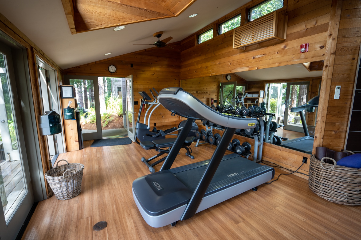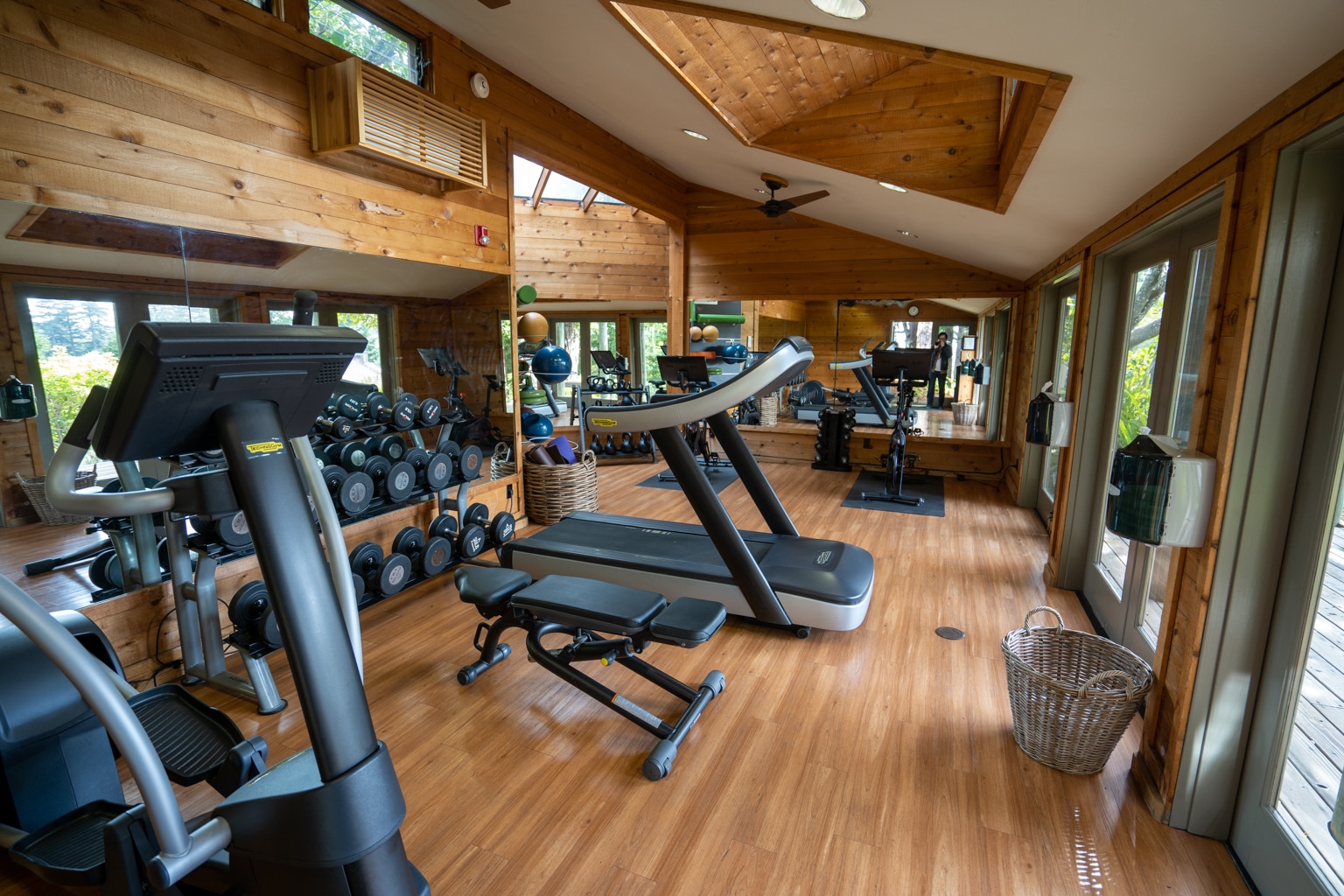 The gym features a treadmill, elliptical, Peloton bikes, and weights, as well as an outdoor area with some resistance bands.