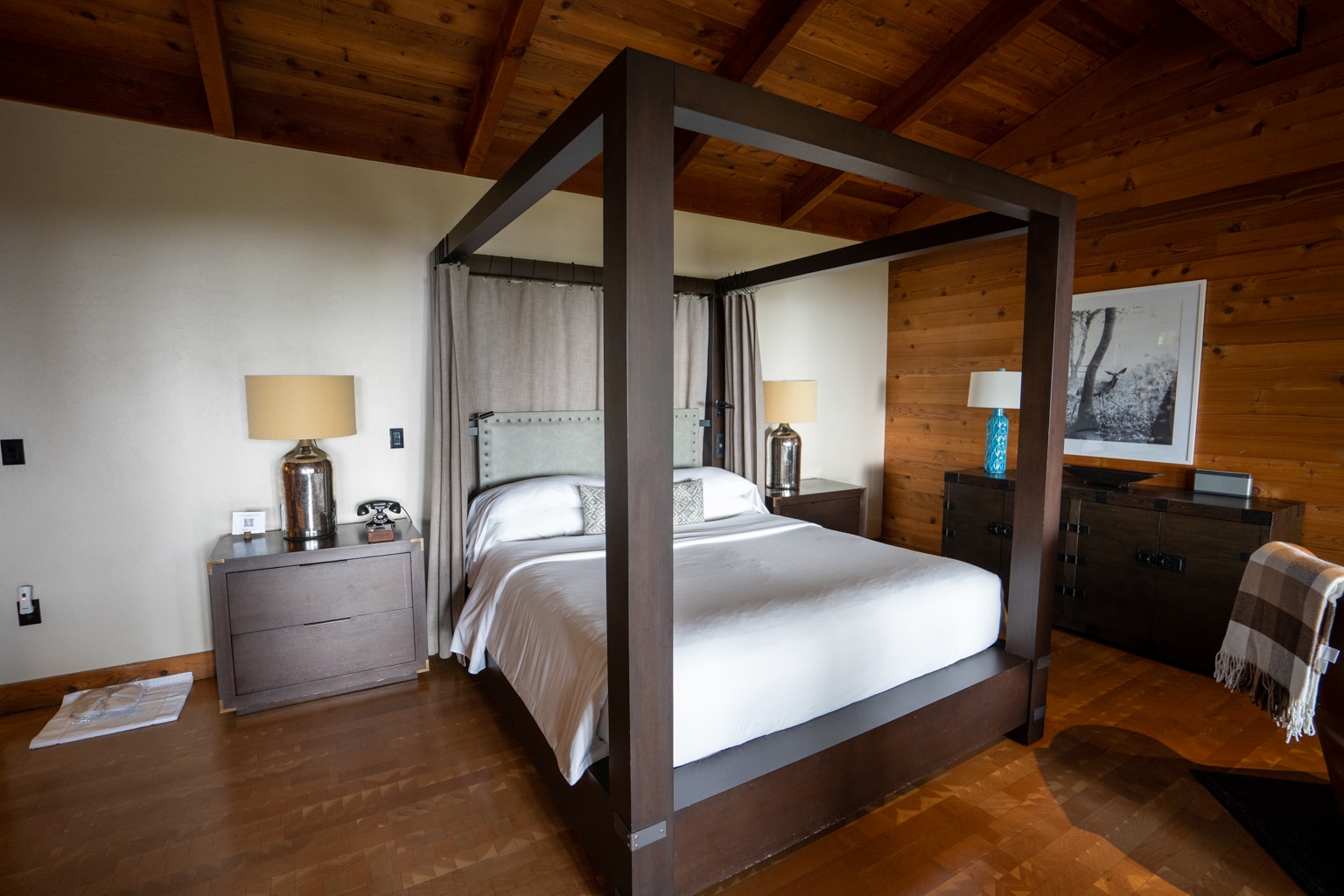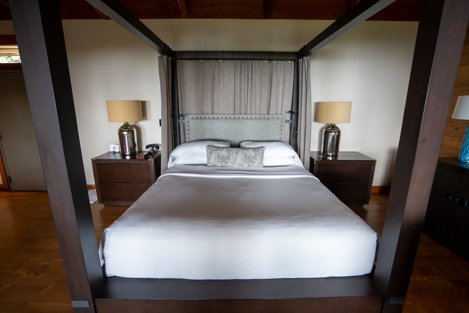 The king-sized bed featured a wooden canopy with curtains that could be drawn for additional privacy. On each side of the bed was a bedside table with lamps and a vintage telephone on the left-hand side.
