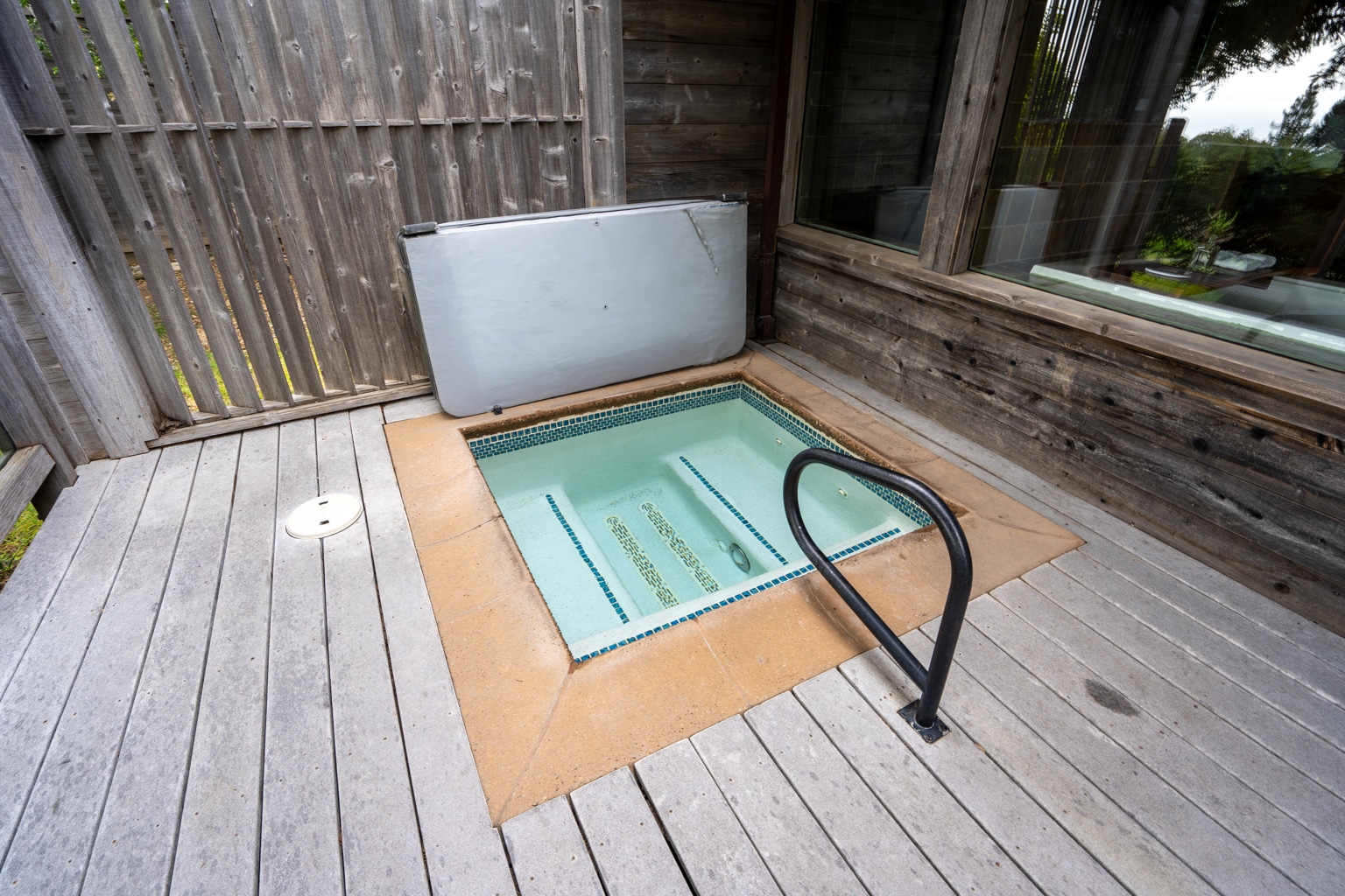 The hot tub had a jacuzzi feature and a slipcover over the tub, allowing for continuous and pleasant heat. There were two lounge chairs on the balcony as well.