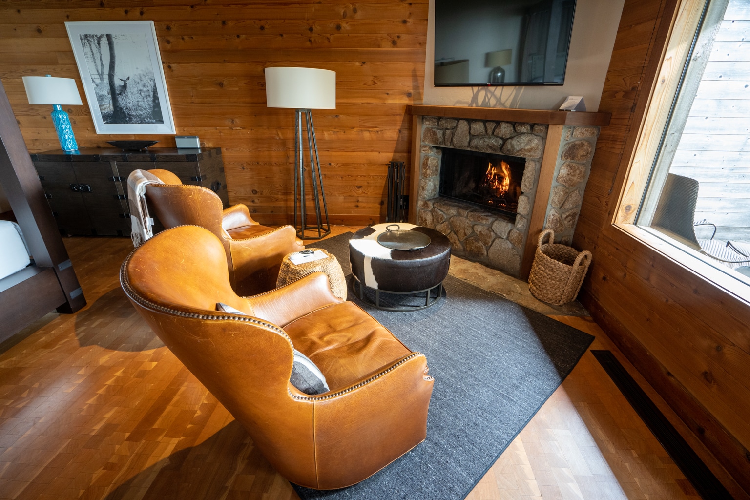 The suite has a table with two dark leather chairs and additional seating near the wood-burning fireplace. These seats were a lighter rich leather, centred around a cow-hide ottoman and small side table.