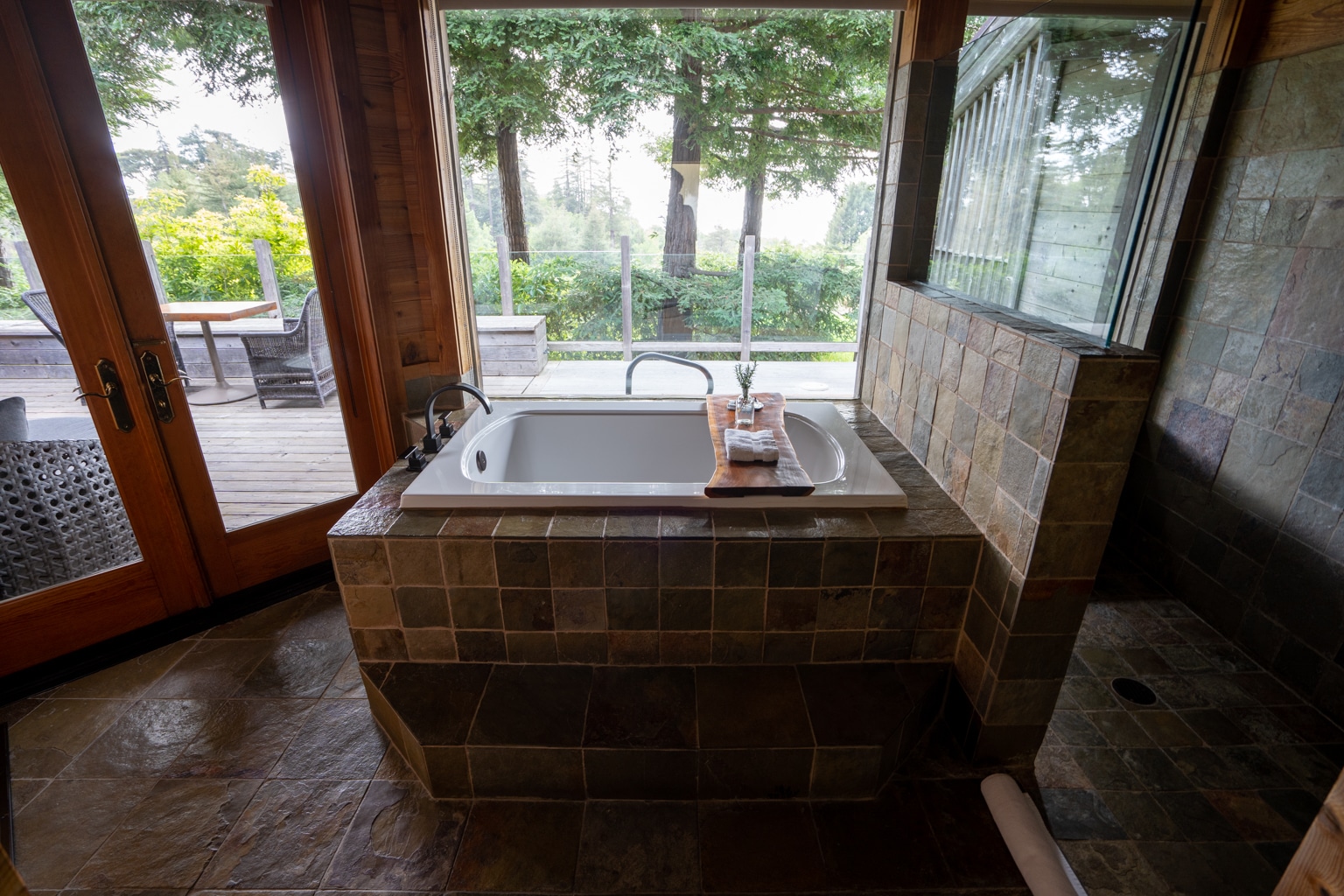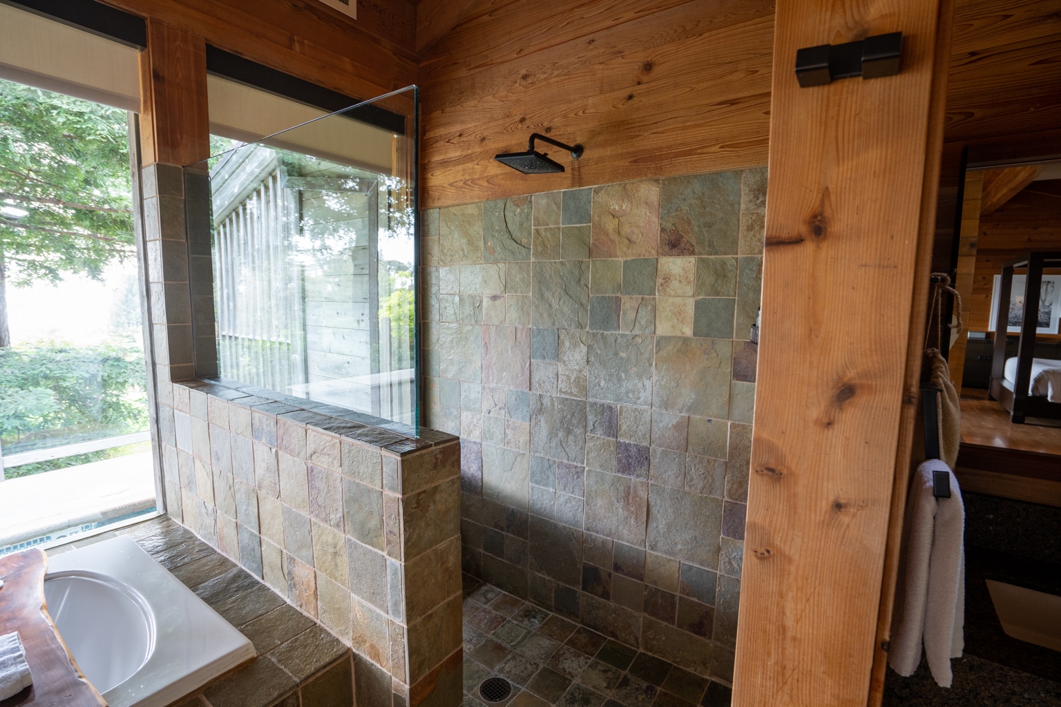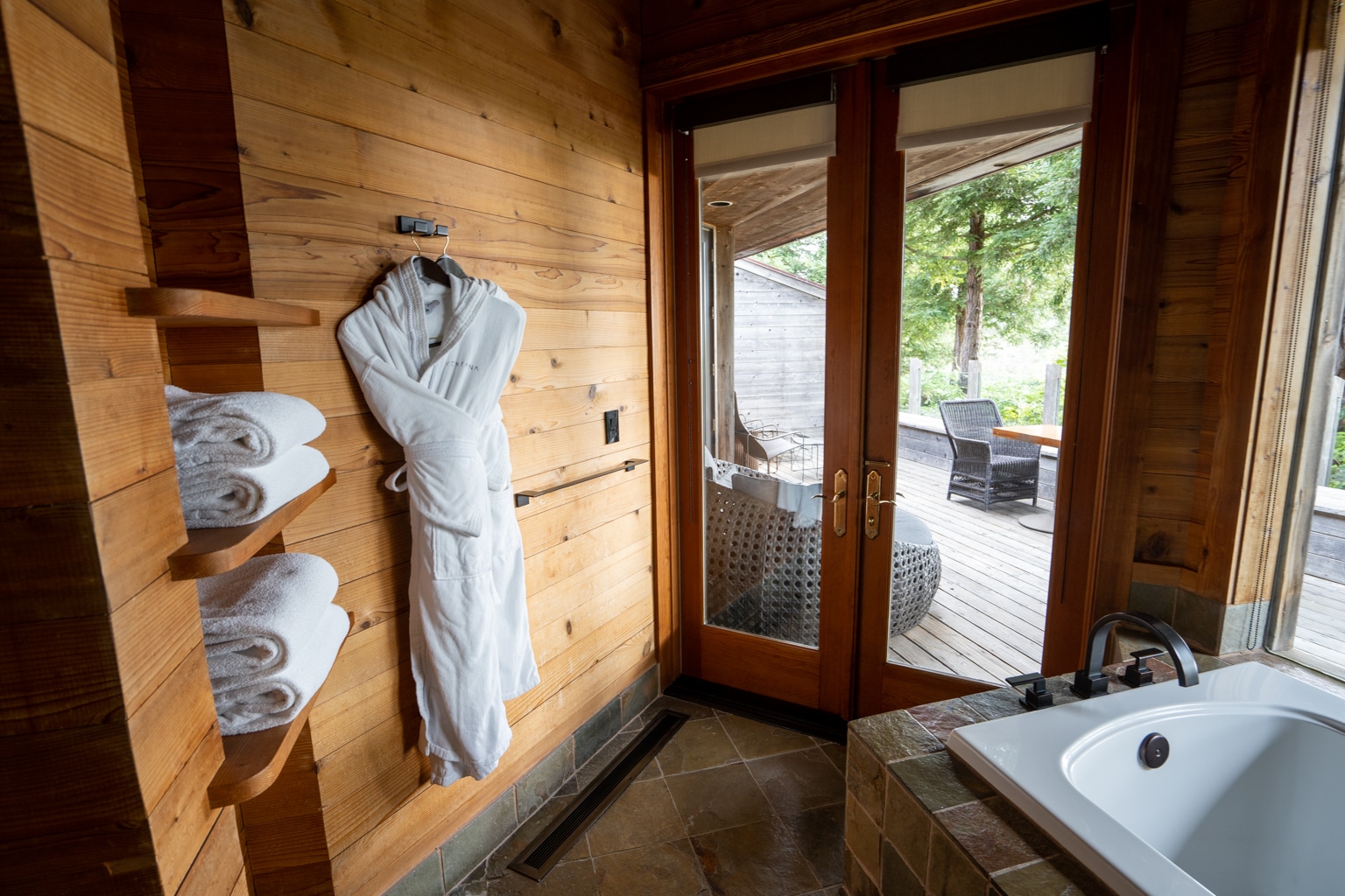 Both the shower and tub offered direct views of the surrounding forest and meadows, and the door on the left-hand side of the tub would grant access to the highlight of this suite: the balcony and hot tub.
