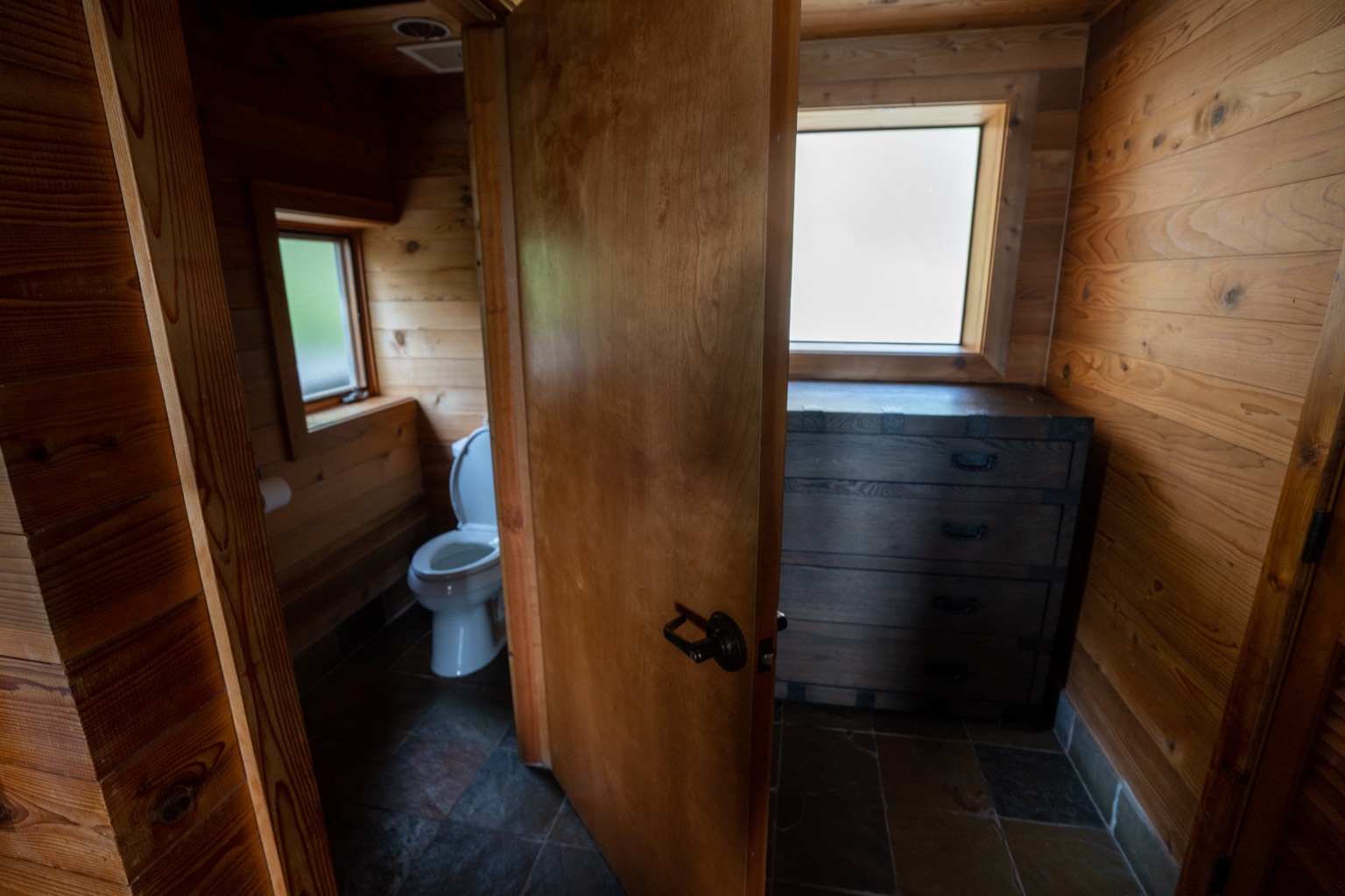 On the right wall of the bedroom was a large rustic bureau for additional storage.
