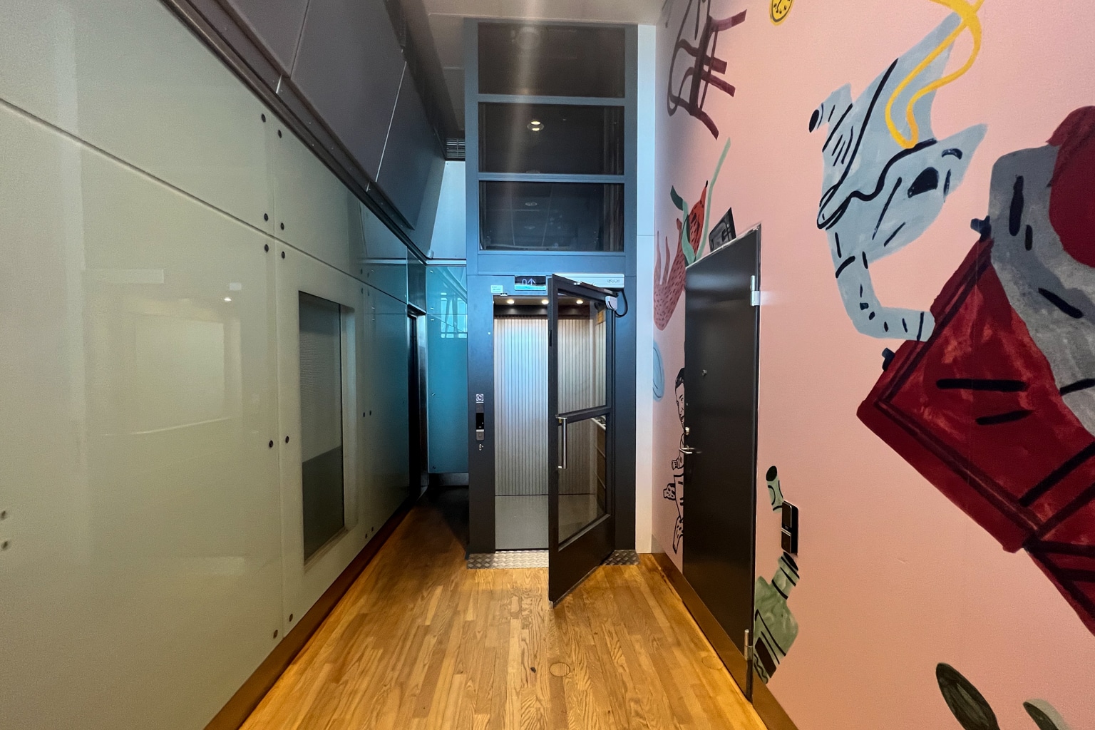 A staircase and elevator lead up to the restaurant and the lounge.