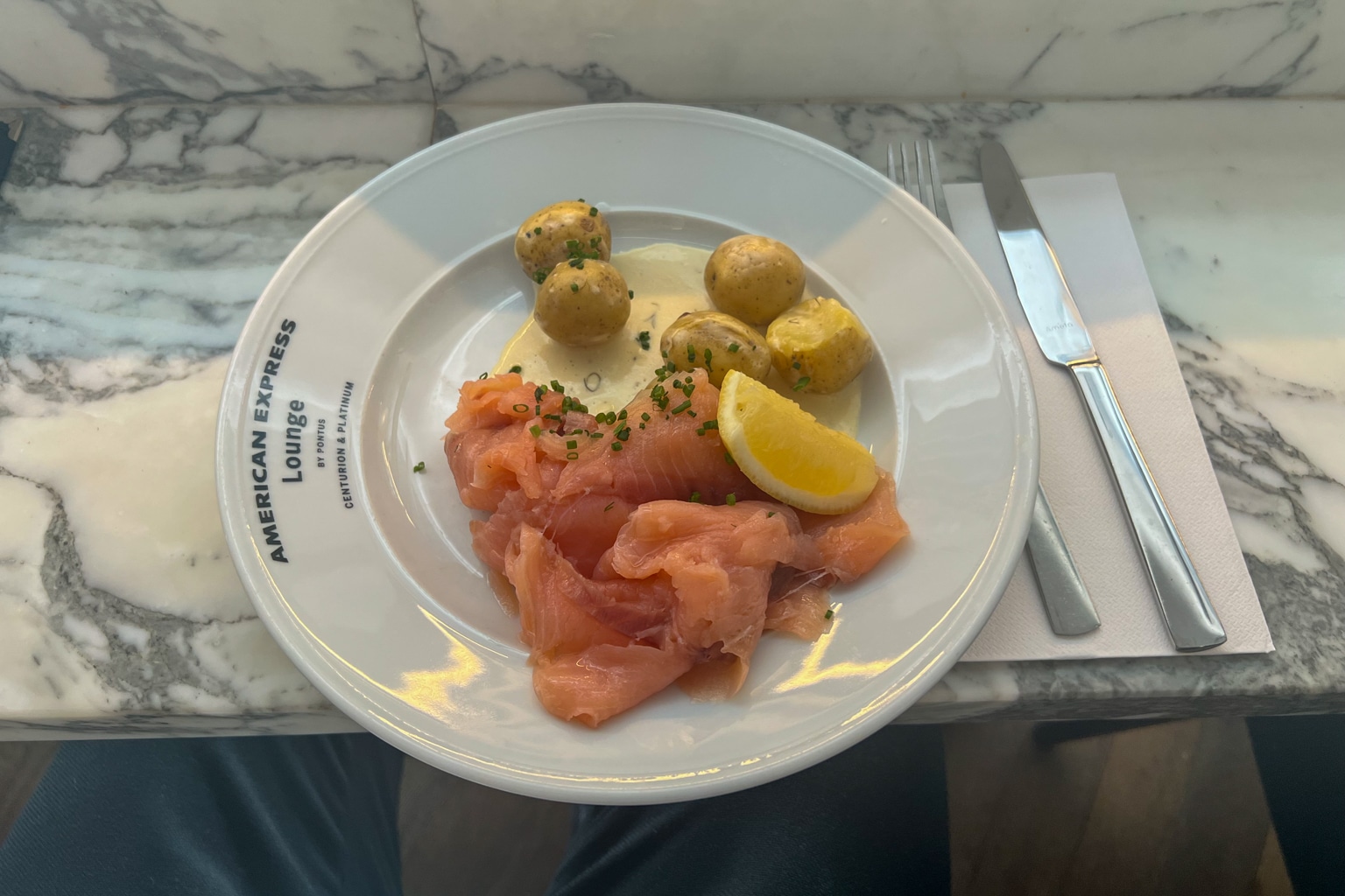 In my case, I was in a bit of a rush and also wanted to save room for food onboard Finnair business class, so I decided to opt for the cured salmon with dill stewed potatoes along with some sparkling water.